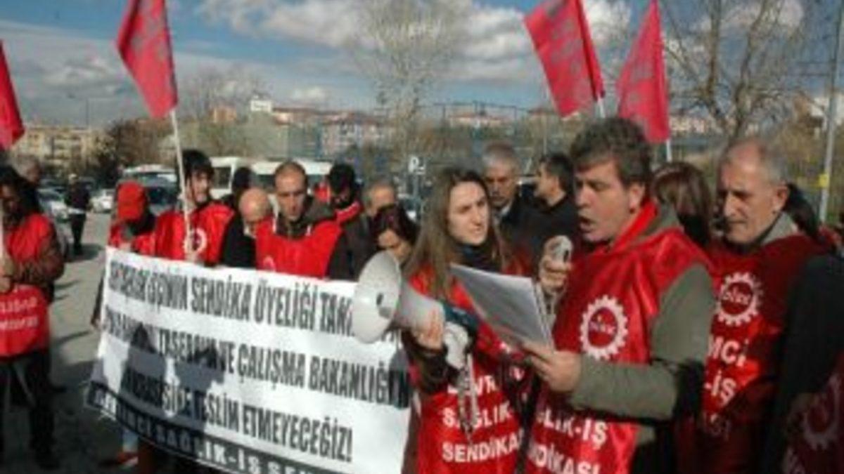Çalışma ve Sosyal Güvenlik Bakanlığı önünde toplanan Dev Sağlık-İş üyesi sağlık çalışanları "10 bin taşeron işçinin sendika üyeliği tanınmıyor, sendika hakkımızı, taşeron ve Çalışma Bakanlığı bürokrasisine teslim etmeyeceğiz" yazılı bir pankart açtı. "Sendika hakkımız engellenemez" gibi sloganlar atan grup adına yapılan açıklamada, yeni çıkarılan 'Sendikalar ve Toplu İş Sözleşmesi Yasasının' taşeron işçilerin sendika hakkını ortadan kaldırdığı, işçilerin çalıştırılmasına aracılık eden taşeron şirketlerin SGK bildirimlerini farklı farklı işkollarından yapmasının ve bunun her ay değişebilir olmasıyla taşeron işçilerin sendika üyeliklerinin yok sayıldığı savunuldu.
