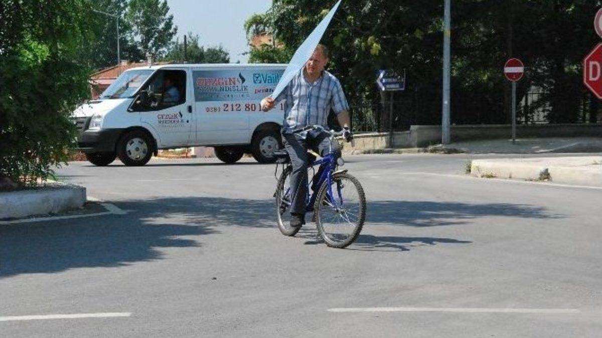 Edirne’de bir bisiklet sürücüsünün, tek eliyle bisiklet kullanırken, diğer eliyle de büyük bir cam taşıması...
