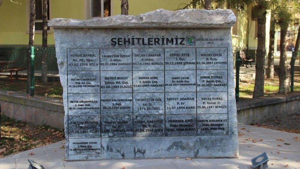 Eskişehir’in Çifteler ilçesinde yaşayan vatandaşlar, meydanında bulunan anıt ile vatan savunması için hayatını kaybeden şehitleri hiçbir zaman unutmuyor.İlçe merkezinde bulunan bir parkın içine yapılan şehitlik anıtı ile Çiftelerli şehitler hiçbir zaman unutulmuyor. 2015 yılında yapılan bu şehitlik anıtı üzerinde, 1976 yılında F-100C ile atış görevi uçuşu esnasında Katran dağına çarparak şehit olan Yunus Baykal’dan, 2015 yılında Diyarbakır’ın Lice ilçesinin kırsal kesiminde PKK ile güvenlik güçleri arasında çıkan çatışmada şehit olan Muhammed Tufan’a kadar olan tüm Çifteler ilçeli şehitler bulunuyor. Ülkemizde yaşanan olaylarda şehit olan polis ve askerlerin isimlerinden oluşan bu anıt, bir mermerin üzerine şehitlerin ismi, vefat ettiği şehir ve yılları yazıyor. Belediye Başkanı Metin Özen tarafından yaptırılan ve daha önce başka bir bölgede duran anıt, şimdilerde ise Çifteler Merkez Çarşı Camisinin gölgesi altında bulunuyor. Meydanda bulunan anıt ile yaşanan olaylarda şehitlik mertebesine ulaşan Çiftelerli vatandaşlar hiçbir zaman unutulmuyor.