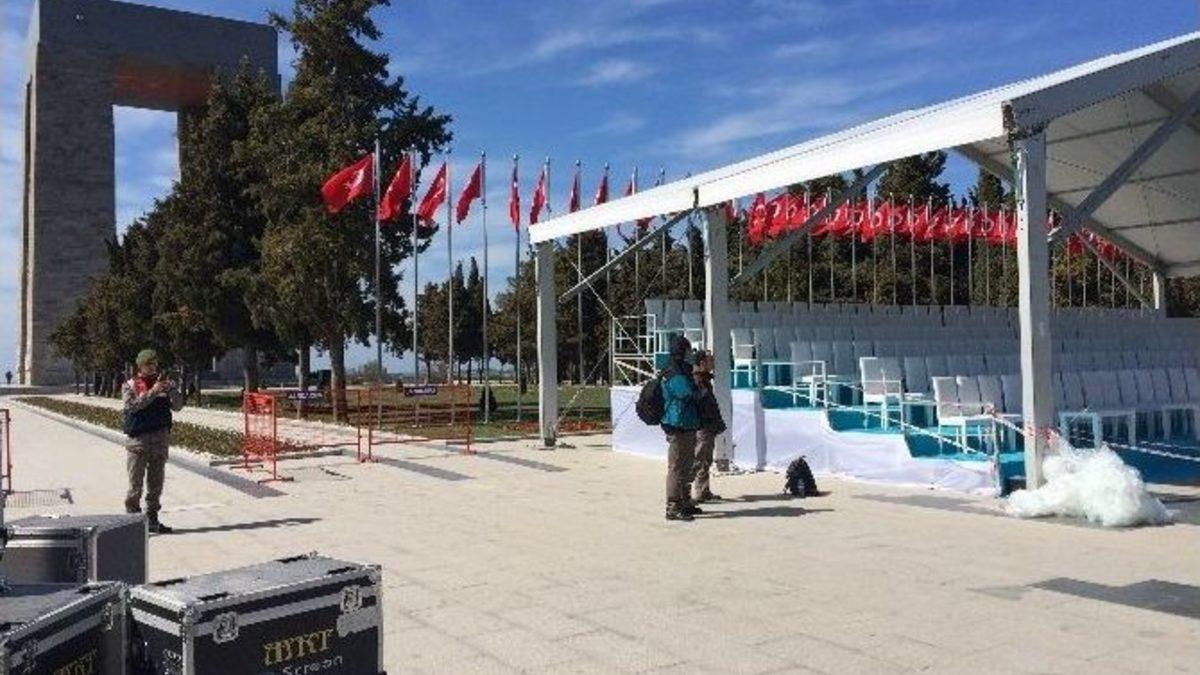 Çanakkale Zaferi’nin 100. yılı dolayısıyla, şehitler abidesi yarın yapılacak törenlere hazırlanıyor.Çanakkale Zaferi’nin 100. yılında düzenlenecek törenler için hazırlıklar yoğun şekilde sürüyor. Başbakan Ahmet Davutoğlu, bakanlar, yabancı heyetler ve vatandaşların katılımıyla gerçekleşecek resmi törenlere ev sahipliği yapacak olan şehitler abidesinde, son hazırlıklar yapılıyor. Abide önündeki tören alanında, geçen senelerden farklı olarak ek bir oturma platformu daha kuruldu. Bu sene, abidedeki törenleri 2 bin 500 kişi takip edebilecek.Çanakkale Boğazı’nda ise savaş gemileri vatandaşları selamlıyor. Boğaza demirleyen 3 savaş gemisi, yarın ziyarete açılacak.