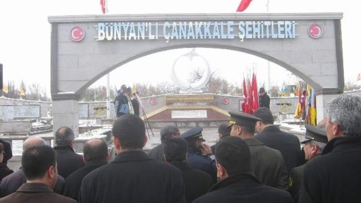 İlk olarak Bünyan’lı Çanakkale şehitliğine Gelen Bünyan Belediye Başkanı Mehmet Özmen, tören öncesinde halkı selamlayarak şehit aileleri ile bir süre görüştü. Bünyan Kaymakamı Engin Aksakal ve Protokol üyelerinin tören alanında hazır bulunmasının ardından Bünyan Kaymakamı Engin Aksakal, Bünyan Belediye Başkanı Mehmet Özmen ve Bünyan İlçe Garnizon komutanı Abdullah Yılmaz’ın çelenk sunumlarının ardından saygı duruşunda bulunuldu ve İstiklal marşı okundu. İstiklal Marşı ile birlikte Bünyan’lı Çanakkale Şehitleri Anıtında göndere bayrak çekildi. Törende günün anlam ve önemini belirten konuşmayı Bünyan İlçe Jandarma Komutanlığında görevli Uzman çavuş Ercan Çınar yaptı.