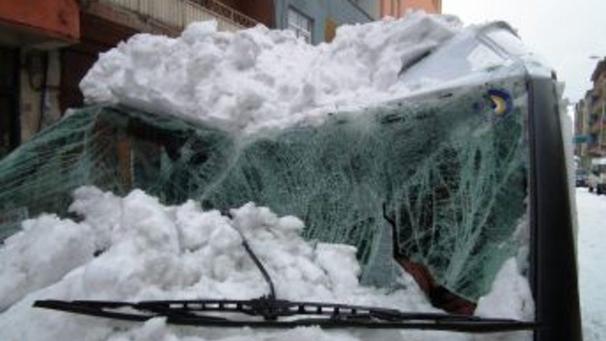 Kars'ın Sarıkamış ilçesinde çatıdan düşen kar, yolcu minibüsünü hurdaya çevirdi. 12 yolcusu bulunan araçta, can kaybının olmaması sevindirdi.