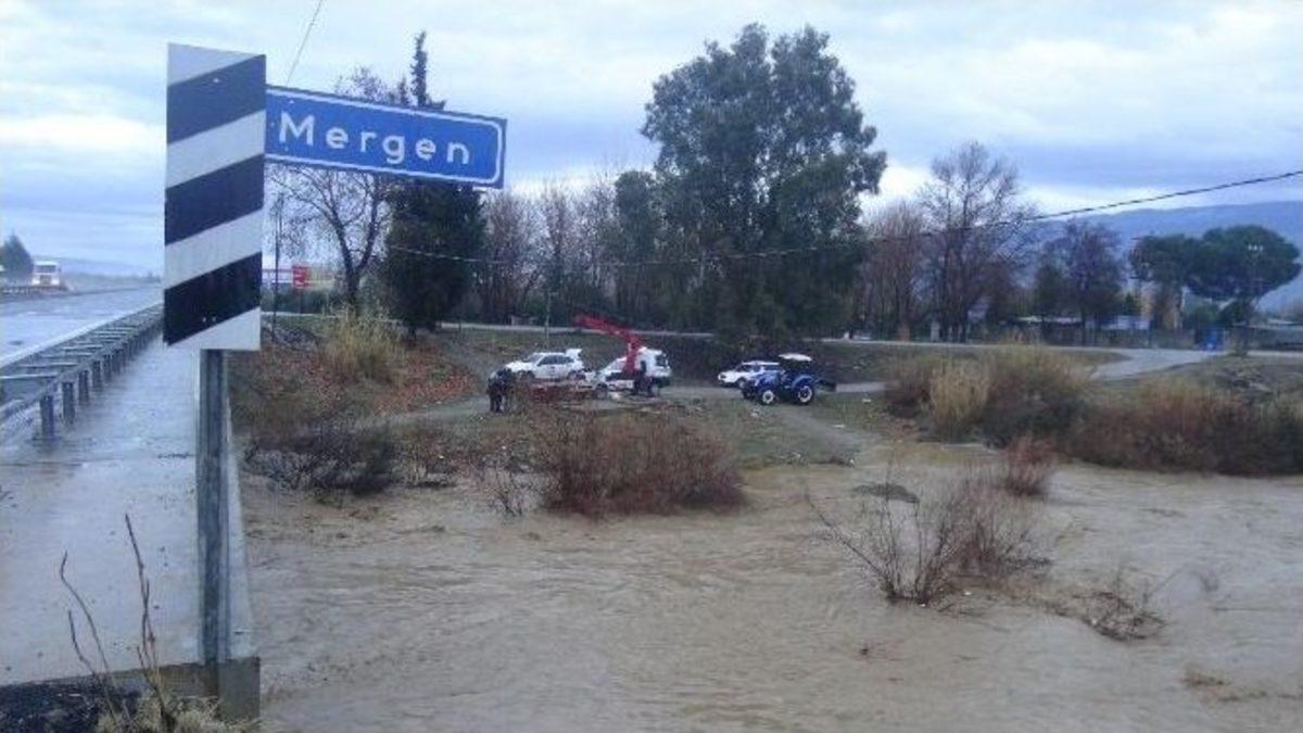Aydın’ın Nazilli İlçesi’ndeki Mergen Çayı’ndan karşıya geçmeye çalışan Muammer Demirbağ yönetimindeki otomobil, taşan derenin suyuna kapılarak sürüklendi.Olay, Aydın- Denizli Karayolu yakınında bulunan Mergen Çayı’nda bugün saat: 18.00 sıralarında meydana geldi. Muammer Demirbağ (61), kendi idaresindeki 09 R 0551 plakalı otomobiliyle Arslanlı Mahallesi istikametinden gelerek Mergen Çayı’ndan karşıya geçmeye çalıştı. Yoğun yağış nedeniyle suyun arttığı Mergen Çayı’nın sularına kapılan otomobil sürüklenmeye başladı. Yaklaşık 400 metre sürüklenen otomobilden inerek canını kurtaran sürücü Muammer Demirbağ’ın haber vermesiyle olay yerine gelen polis ve kurtarma ekipleri, Mergen Köprüsü’nün altında takılan otomobili kurtardı. Kimsenin yaralanmadığı olayda, maddi hasar meydana geldi.