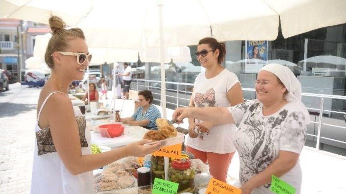Çeşme Belediyesi’nin kurduğu üretici kadınlar pazarında, hem ev hanımlar ek gelir sağlıyor hem de tezgahlara uğrayan turistler ev yemekleri ile buluşuyor.