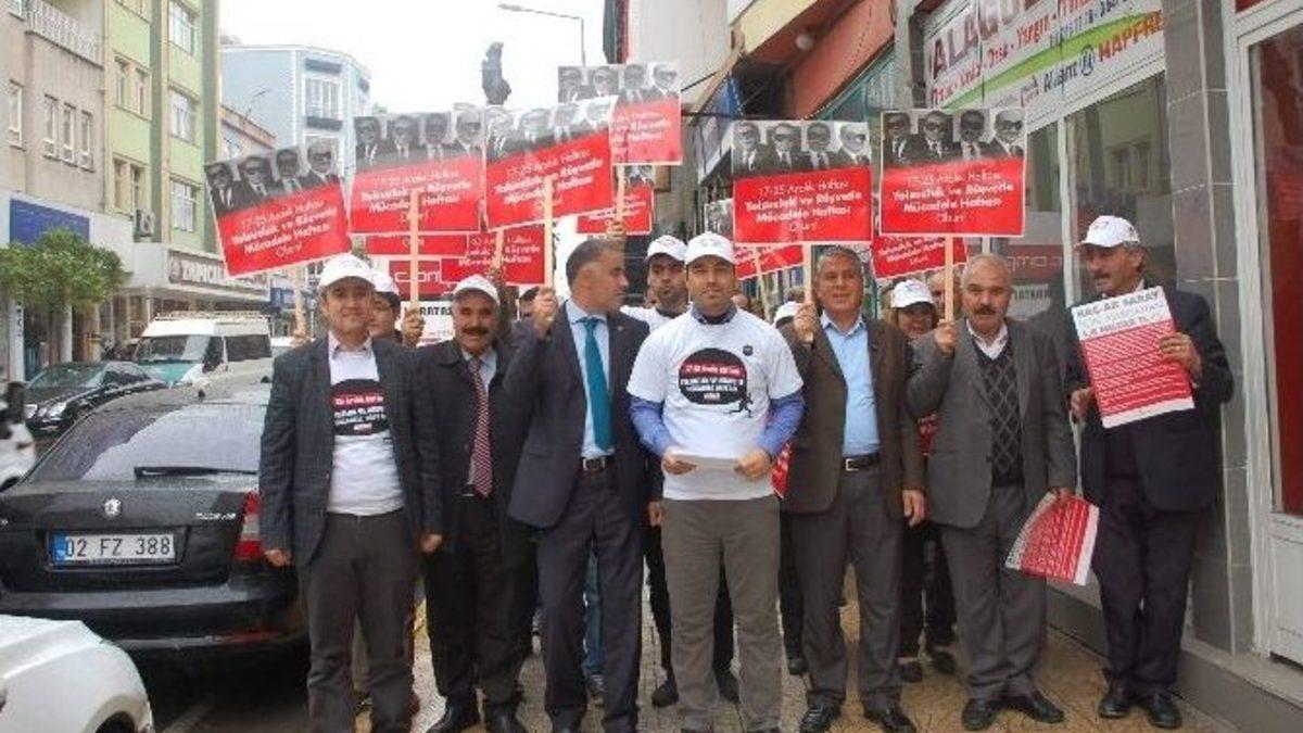 Cumhuriyet Halk Partisi (CHP) Adıyaman Gençlik Kolları üyeleri tarafından 17-25 Aralık operasyonları ile alakalı tişörtler giyilerek, basın açıklaması yapıldı.Parti binası önünde basın açıklamasını okuyan CHP Adıyaman İl Gençlik Kolları Başkanı Engin Özer, “17-25 Aralık yolsuzluk operasyonları bu ülkeyi yönetenlerin hırsızlık ve yolsuzluğa bulaştığını ifşa etmiştir. Bizler Cumhuriyet Halk Partisi Gençlik Kolları Başkanlığı olarak hırsızlığa ve yolsuzluğa ismi bulaşan insanların acilen yargı önüne çıkarılıp gerekli adli süreçler içerisinde cezalandırılmadıkları sürece AKP iktidarı üzerindeki bu kara lekeyi silemeyecektir. Bu ülkenin gerçeği giyecek ayakkabı bulamayan Recep amca, atanamayan öğretmenler, sokak ortasında öldürülen gençler, madende yaşamını yitiren yiğitler, intihar eden insanlar, öldürülen kadınlar, hırsızlığa ve yolsuzluğa isimleri bulaşan kişilerdir. Kamuoyu vicdanında 17-25 Aralık haftası yolsuzluk ve rüşvetle mücadele haftası olarak yer bulmuştur. Bizler de Cumhuriyet Halk Partisi Gençlik Kolları olarak 17-25 Aralık yolsuzluk ve rüşvetle mücadele haftası olsun diyoruz” şeklinde konuştu.Basın açıklamasına CHP İl Başkanı Av. Bilal Doğan, CHP Adıyaman Merkez İlçe Başkanı Hanifi Çavuş, CHP Adıyaman İl Gençlik Kolları Başkanı Engin Özer ve parti üyeleri katıldı.