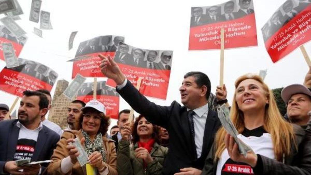 Emre BAYLAN/ANTALYA, Antalya'da 17 Aralık operasyonunun yıl dönümünde CHP İl Örgütü, tarihi Kalekapısı'ndaki Attalos Meydanı'nda eylem yaptı. Sloganlarla hükümeti istifaya davet eden 300 kadar CHP'li, Aydın il başkanlığında polisle krize neden soruşturmada adı geçen 4 eski bakan Muammer Güler, Egemen Bağış, Erdoğan Bayraktar ve Zafer Çağlayan'ın maskeli fotoğraflarının yer aldığı dövizler taşıdı. '17 - 25 Aralık Yolsuzlukla Mücadele Haftası Kutlu Olsun' yazılı dövizlerle birlikte CHP'liler beraberinde getirdikleri ayakkabı kutularından çıkan sahte dolarları havaya atarak iktidarı protesto etti.