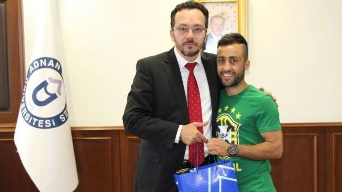 Katıldığı iki turnuvada derece elde eden ADÜ Beden Eğitimi ve Spor Yüksekokulu Beden Eğitimi Öğretmenliği Bölümü 1. sınıf öğrencisi Sedat Demir, ADÜ Rektörü Prof. Dr. Cavit Bircan’ı ziyaret etti.Marmaris’te 18-20 Mart 2016 tarihleri arasında düzenlenen Üniversiteler Arası Kickboks Türkiye Şampiyonası ve 18-24 Nisan 2016 tarihleri arasında Antalya’da düzenlenen Üniversiteler Arası Muay Thai Türkiye Şampiyonalarının her ikisinde de ‘Türkiye Şampiyonu’ unvanını kazanan ADÜ Beden Eğitimi ve Spor Yüksekokulu Beden Eğitimi Öğretmenliği Bölümü 1. sınıf öğrencisi Sedat Demir, ADÜ Rektörü Prof. Dr. Cavit Bircan’ı makamında ziyaret etti.ADÜ Rektörü Prof. Dr. Cavit Bircan üniversite olarak her zaman sporu ve sporcuyu desteklediklerini belirterek Sedat Demir’i göstermiş olduğu başarıdan dolayı tebrik etti. ADÜ’yü temsil etmekten duyduğu memnuniyeti dile getiren Sedat Demir, gösterilen ilgiden ve destekten dolayı Bircan’a teşekkür ederek bundan sonraki şampiyonalarda da başarı sözü verdi.
