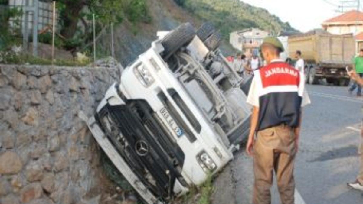 Edinilen bilgilere göre, Karadeniz Ereğli ilçesinde Organize Sanayi Bölgesi’ndeki (OSB) bir fabrikadan çimento yükleyip Gebze’ye gitmek üzere yola çıkan İbrahim Sakarya (34) idaresindeki 41 TD 518 plakalı TIR ile 41 TD 384 plaklı çekicisi, Göktepe mevkisinde virajı alamayarak su kanalına devrildi. Ters dönen TIR'ın içerisinde kalan sürücü çevredekilerin yardımı ile çıkartılarak, ambulansla Ereğli Devlet Hastanesi’ne kaldırıldı. Sakarya’nın hayati tehlikesinin bulunmadığı öğrenilirken, jandarma kazayla ilgili soruşturma başlattı.