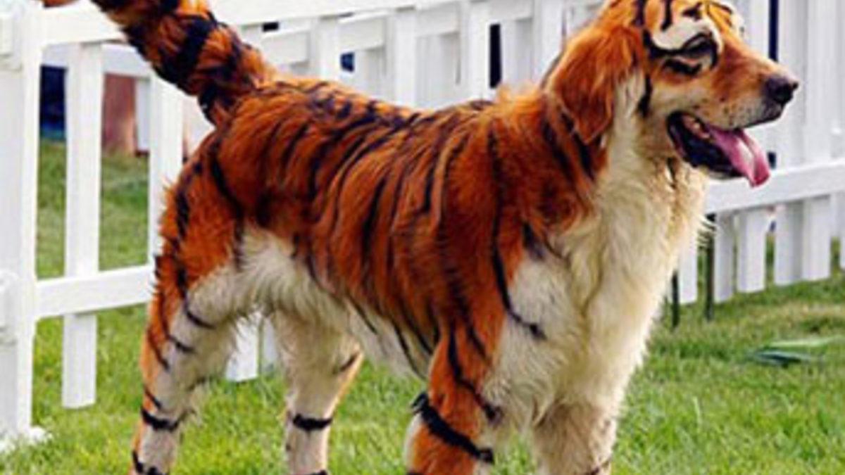 Uzaktan bakınca vahşi bir kaplanı andıran bu av köpeği aslında Çin'deki köpek sahipleri arasında yaşanan yeni bir çılgınlığın kurbanı. Bu trendin tek kurbanı av köpekleri de değil. Resimdeki tüylü ve küçük köpeklere uygulanan boyama daha başarılı. Onlara bebek panda makyajı yapılmış.
