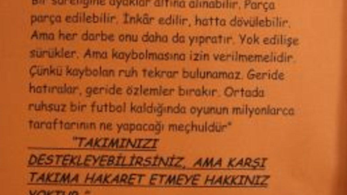 Perihan Tulan?İlköğretim?Okulu öğrencilerinin duygularını dile getirdiği broşür Düzce Amatör Spor Kulübü’nde ağabeylerine örnek oldu. Öğrenciler, “Futbolun bir ruhu vardır. Ruhlar kırılgandır. Bir süreliğine ayaklar altına alınabilir.?Parça parça edilebilir.?İnkar edilir, hatta dövülebilir.?Ama her darbe onu daha da yıpratır. Yok edilişe sürükler. Ama kaybolmasına izin verilmemelidir.?Çünkü kaybolan ruh tekrar bulunamaz. Geride hatıralar, geride özlemler bırakır. Ortada ruhsuz bir futbol kaldığında oyunun milyonlarca taraftarının ne yapacağı meçhuldür. Dünyada tüm sınırlar yapaydır. Çünkü en önemli sınır gönüllerin sınırıdır” dediler.