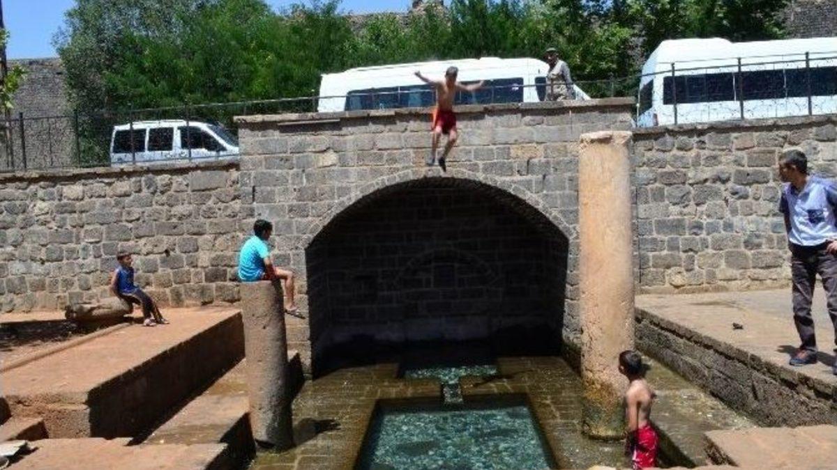Diyarbakır’da sıcaktan bunalan çocuklar, serinlemek için girdikleri süs havuzlarında, tehlikeye davetiye çıkarıyor. Yaklaşık 5 metre yükseklikten 80 santim derinliğindeki suya atlayan çocuklar ölümle burun buruna geliyor.Diyarbakır’ın Sur ilçesinde bulunan Anzele Parkı, çocukların eğlence yeri olması dışında büyük bir tehlikeyi içerisinde barındırıyor. Serinlemek amacıyla parkta bulunan suya giren çocuklar, derinliği 80 santimetreyi bulan suya, 5 metre yükseklikten atlıyor. Yaralanma, hatta ölümle sonuçlanabilecek kazaları göz ardı eden çocuklar, tehlikenin farkında olmadan her gün ölümle burun buruna geliyor.Çocukların tehlikenin farkında olmadığını belirten Abdurrahman Kocakaya isimli vatandaş, parkın çocukların eğlenmesi için uygun olduğunu söyledi. Parkta bulunan süs havuzlarına çocukların atlamasının tehlikeli olduğunu belirten Kocakaya, hiçbir önlemin alınmadığını, bazı çocukların suya atladıktan sonra ciddi şekilde yaralandığını gördüklerini ifade etti. Yetkililerden tehlikeli durumun önlenmesi için çalışma beklediklerini kaydeden Kocakaya, "Ailelerin de çocuklarını yüksekten atlamamaları, suya girmemeleri konusunda uyarmaları lazım. Ölüm olayı yaşanmadan yetkililerin önlem alması gerekir" dedi.Çocuklar da, sıcak havalardan bunaldıklarını ve serinlemek için parka geldiklerini kaydetti.