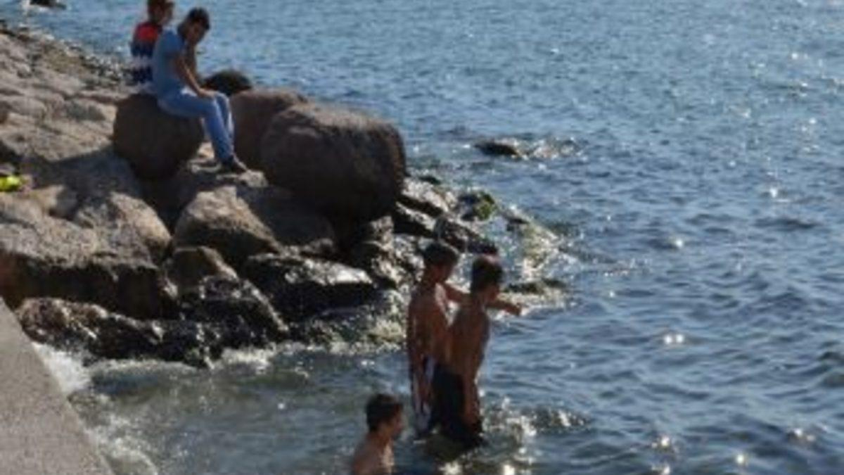 İzmir’de, sıcaktan bunalan çocuklar körfeze girerek serinlemeye çalıştı.