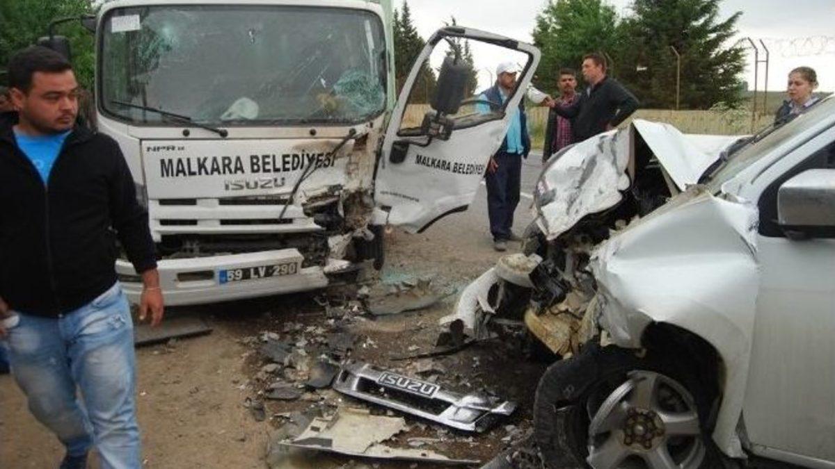 Tekirdağ’ın Malkara ilçesinde hatalı sollama sonucu pikap ile belediyeye ait çöp kamyonunun kafa kafaya çarpıştığı kazada 1’i ağır 4 kişi yaralandı. Kazada iki araç hurdaya döndü.Kaza, sabah saatlerinde Hayrabolu yolu üzeri Erenler mevkiinde meydana geldi. İddiaya göre, Malkara’dan Hayrabolu istikametine seyrederken hatalı sollama yaptığı öğrenilen Hüseyin Pullukçu yönetimindeki 59 LZ 111 plakalı pikap, karşı yönden gelen Hasan İnce yönetimindeki 59 LV 290 plakalı Malkara Belediyesi’ne ait çöp kamyonu ile kafa kafaya çarpıştı.Kazada hurdaya dönen araçlarda, Hüseyin Pullukçu, Hasan İnce ve Mehmet Garip yaralanırken, başı cama çarpan Hasan Eren ise ağır yaralı olarak Malkara Devlet Hastanesi’ne kaldırıldı. Kazayla ilgili soruşturma başlatıldı.