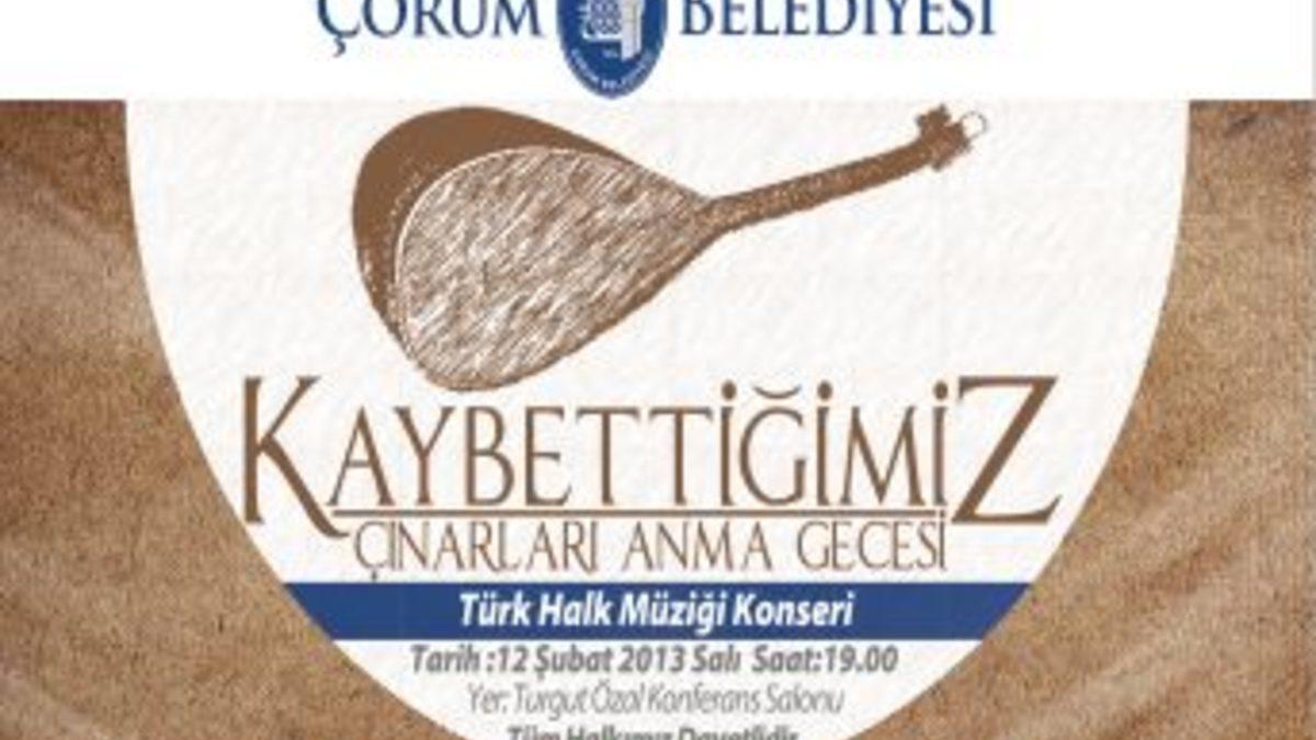 Çorum Belediyesi, kültür etkinlikleri kapsamında 'Kaybettiğimiz Çınarlara Vefa' programı düzenleyecek. 12 Şubat Salı günü Belediye Konferans Salonu'nda gerçekleştirilecek olan programda ölen ozan ve Türk Halk Müziği'ne katkı sağlayanlar anılacak.