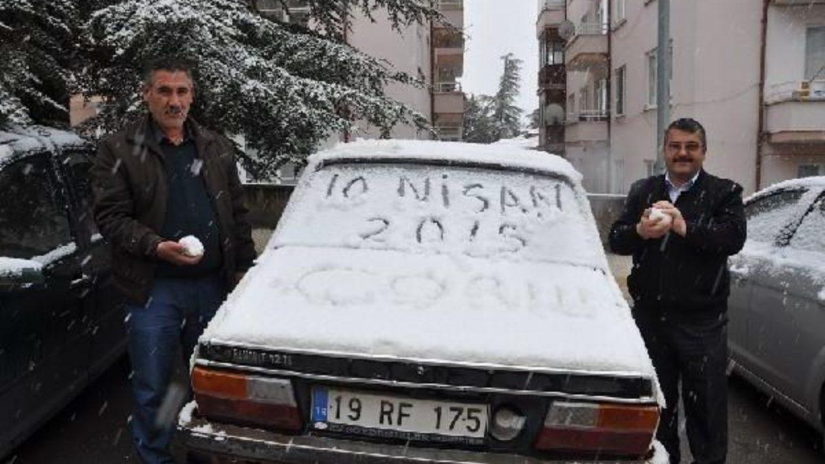 Yusuf ÇINAR/ ÇORUM, Çorum'da dün gece başlayan karla karışık yağmur sabah saatlerinde yerini kara bıraktı. Nisan ayında kar yağdığını gören vatandaşlar şaşkınlık yaşadı. Bazı vatandaşlar ise karla kaplı zemin üzerine günün tarihini yazarak hatıra fotoğrafı çektirdi. Kentin yüksek kesimdeki ilçelerindeki karayollarında kar nedeniyle zaman zaman ulaşımda aksamalar yaşandı. Kentte hava sıcaklığı -1 dereceye kadar düştü.