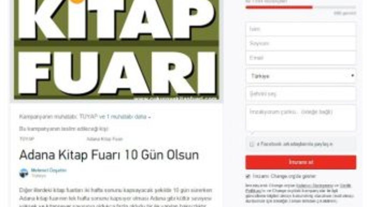 Ocak ayında düzenlenecek Çukurova Kitap Fuarı süresinin 10 güne çıkarılması için başlatılan imza kampanyasına şimdiye kadar bin 500 kişi imza attı.Kamuoyu oluşturma ve yaptırım gücüyle dikkat çeken ’Change.Org’ isimli internet sitesinden, Çukurova Kitap Fuarı süresinin 6 günden 10 güne uzatılması için imza kampanyası başlatıldı. Mehmet Özşahin tarafından başlatılan kampanyayla ilgili ilgili olarak, "Adana gibi kültür seviyesi yüksek ve kitapsever sayısının oldukça fazla olduğu bir ile yapılan haksızlıktır. Adanalı kitapseverler olarak biz de kitap fuarımızın en az 2 haftasonunu kapsayacak uzunlukta olmasını istiyoruz" ifadesine yer verildi.Kısa sürede destekçi bulan imza kampanyası, sosyal medyada hızla yayıldı. Kampanyaya şuana kadar bin 500 kişi imza attı.Kampanyaya yapılan yorumların bazıları şöyle:Neşe K.: "Adanalı sanatseverdir, okuyucu değil gerçek okurdur. Bizleri kitap kokusundan mahrum etmeyin."Tülay E.: "Çalışan insanların daha iyi faydalanabileceğini düşünüyorum."Ganimet Ö.: "En sevdiğimiz yazarlar ile daha fazla vakit geçirmek istiyoruz."