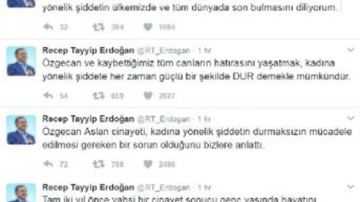 #ÖzgecanAslan hashtag'ı ile paylaşımlarda bulunan Cumhurbaşkanı Erdoğan , "Biricik kızımız Özgecan'ı bu vesileyle rahmetle yad ediyor, kadına yönelik şiddetin ülkemizde ve tüm dünyada son bulmasını diliyorum. Özgecan Aslan cinayeti, kadına yönelik şiddetin durmaksızın mücadele edilmesi gereken bir sorun olduğunu bizlere anlattı. Özgecan ve kaybettiğimiz tüm canların hatırasını yaşatmak, kadına yönelik şiddete her zaman güçlü bir şekilde DUR demekle mümkündür.Biricik kızımız Özgecan'ı bu vesileyle rahmetle yad ediyor, kadına yönelik şiddetin ülkemizde ve tüm dünyada son bulmasını diliyorum" dedi.