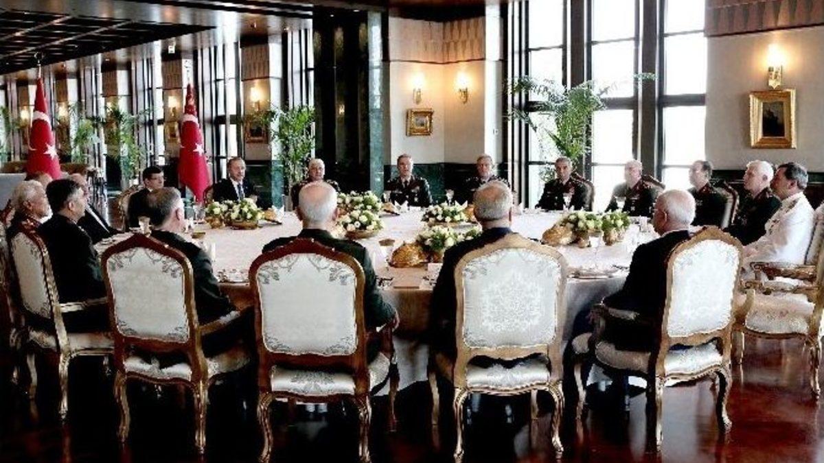 Cumhurbaşkanı Recep Tayyip Erdoğan, Yüksek Askeri Şura (YAŞ) üyeleriyle öğle yemeğinde bir araya geldi.Cumhurbaşkanlığı Külliyesi’ndeki yemeğe, Başbakan Ahmet Davutoğlu’nun yanı sıra Milli Savunma Bakanı Vecdi Gönül, Genelkurmay Başkanı Orgeneral Necdet Özel, Kara Kuvvetleri Komutanı Orgeneral Hulusi Akar, Deniz Kuvvetleri Komutanı Oramiral Bülent Bostanoğlu, Hava Kuvvetleri Komutanı Orgeneral Akın Öztürk, Jandarma Genel Komutanı Orgeneral Abdullah Atay ve Genelkurmay 2. Başkanı Orgeneral Yaşar Güler ile YAŞ üyesi komutanlar katıldı.Başbakan Davuoğlu ile Genelkurmay Başkanı Orgeneral Özel aynı makam aracı ile Cumhurbaşkanlığı Külliyesi’ne geldi. Yemek basına kapalı olarak gerçekleştiriliyor.