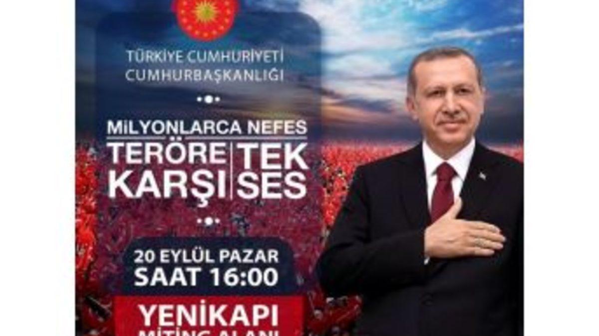Cumhurbaşkanı Recep Tayyip Erdoğan, vatandaşları İstanbul’da düzenlenecek "Milyonlarca Nefes, Teröre Karşı Tek Ses" mitingine davet etti.Cumhurbaşkanı Erdoğan, sosyal paylaşım sitesi Twitter’daki hesabı üzerinden, "Tüm vatandaşları bir olmaya, birlik olmaya, teröre karşı tek ses olmaya, Yenikapı’ya davet ediyorum" mesajını paylaşarak, İstanbul Yenikapı miting alanında pazar günü yapılacak "Milyonlarca Nefes, Teröre Karşı Tek Ses" mitingine vatandaşları davet etti.20 Eylül Pazar günü Yenikapı’da yapılacak mitinge Cumhurbaşkanı Recep Tayyip Erdoğan, TBMM Başkanı İsmet Yılmaz ile Başbakan Ahmet Davutoğlu katılacak.