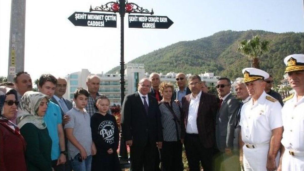 Marmaris’te 15 Temmuz gecesi Cumhurbaşkanı Erdoğan’ın oteline darbeci askerler tarafından gerçekleştirilen suikast girişimi sırasında şehit düşen İlçe Emniyet Müdürlüğü Asayiş şubede görevli polis memuru Nedip Cengiz Eker ve Cumhurbaşkanı Recep Tayyip Erdoğan’ın yakın koruması olan Mehmet Çetin’in adları olayın gerçekleştiği otelin yakınındaki iki caddeye verildi.Marmaris Belediye meclisi tarafından 15 Temmuz darbe girişimi gecesinde şehit olan polis memuru Nedip Cengiz Eker ve Cumhurbaşkanı Recep Tayyip Erdoğan’ın yakın koruması olan Mehmet Çetin’in adlarının caddeye verilmesine karar verildi.Şehitlerin isminin verileceği Turban kavşağındaki park alanında tören düzenlendi. Şehitlerimiz anısına saygı duruşunda bulunulup, İstiklal Marşı’nın söylenmesinin ardından Şehit Mehmet Çetin ve Şehit Nedip Cengiz Eker’in özgeçmişleri okundu.Marmaris Belediye Başkanı Ali Acar, isim törenine projede emeği geçenlere teşekkür etti.Acar, “Ailelerimizin yüreklerine bir damla su serpebildiysek Türk vatandaşı olarak ne mutlu” dedi.Muğla Valisi Amir Çiçek, törende yaptığı konuşmada 15 Temmuz darbe gecesi herkesin göğsünü siper ettiğini ve bu direniş göstergelerinden dolayı özellikle Marmaris vatandaşına teşekkür etti.Çiçek, Marmaris Belediye Başkanı Ali Acar ve meclis üyelerinde demokrasi nöbetinde göstermiş oldukları tavırdan dolayı teşekkür etti.Şehit Nedip Cengiz Eker’in babası Nedim Eker de isim töreninde vatana ihanet eden teröristlerin vatandaşlıktan çıkartılarak idamla cezalandırılmalarını istedi.Konuşmaların ardından şehitlerin adlarının yazılı bulunduğu cadde tabelaları, şehit yakınları ve protokol üyeleri tarafından açıldı.