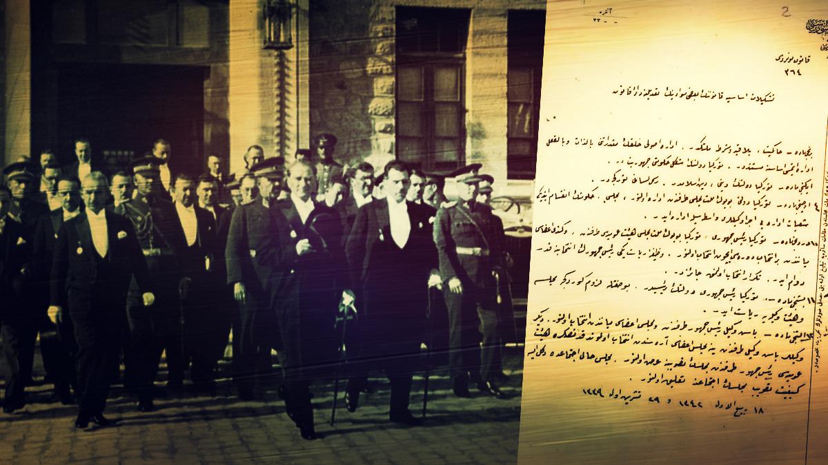 'Hâkimiyet, bilâ kayd ü şart milletindir. İdare usulü halkın mukadderatını bizzat ve bilfiil idare etmesi esasına müsteniddir. Türkiye Devleti’nin şekl-i hükümeti Cumhuriyettir.'"
