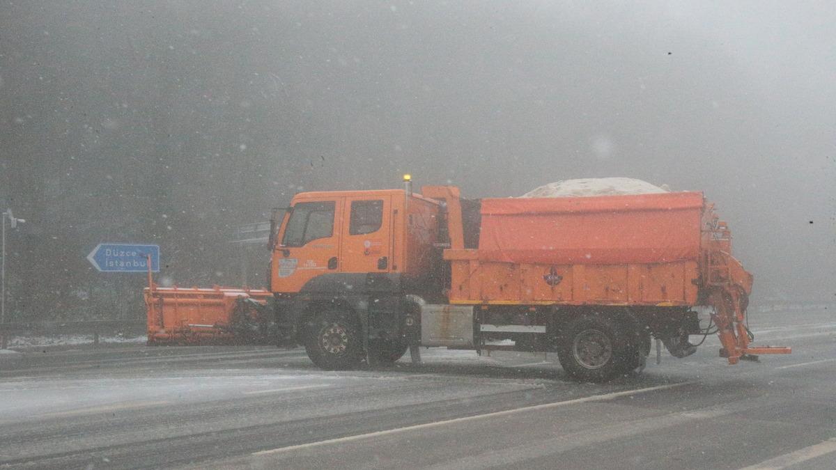 Yağışın ardından kısmen beyaz örtüyle kaplanan ve sisin de hakim olduğu güzergahta Karayolları ekipleri, kar küreme ve tuzlama çalışması yürütüyor.