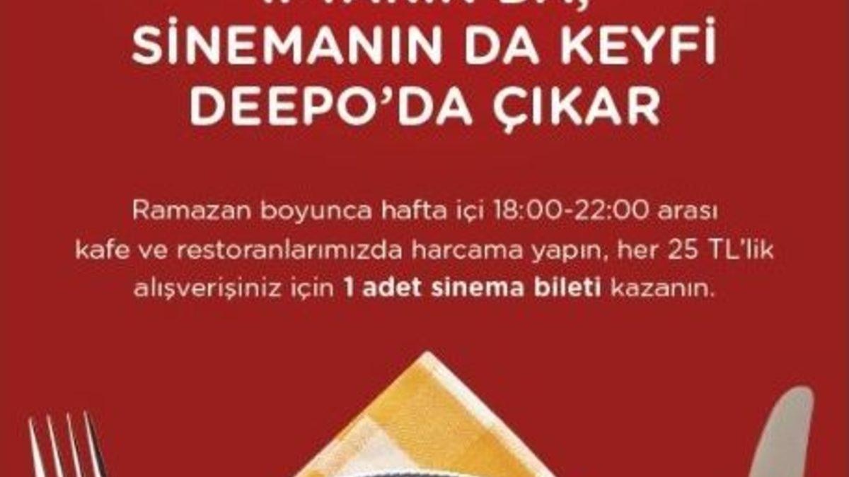 Ramazan boyunca hafta içi 18:00 - 22:00 saatleri arasında Deepo Outlet kafe ve restoranlarında yapılacak her 25 TL’lik alışverişe sinema bileti hediye edileceği bildirildi.
