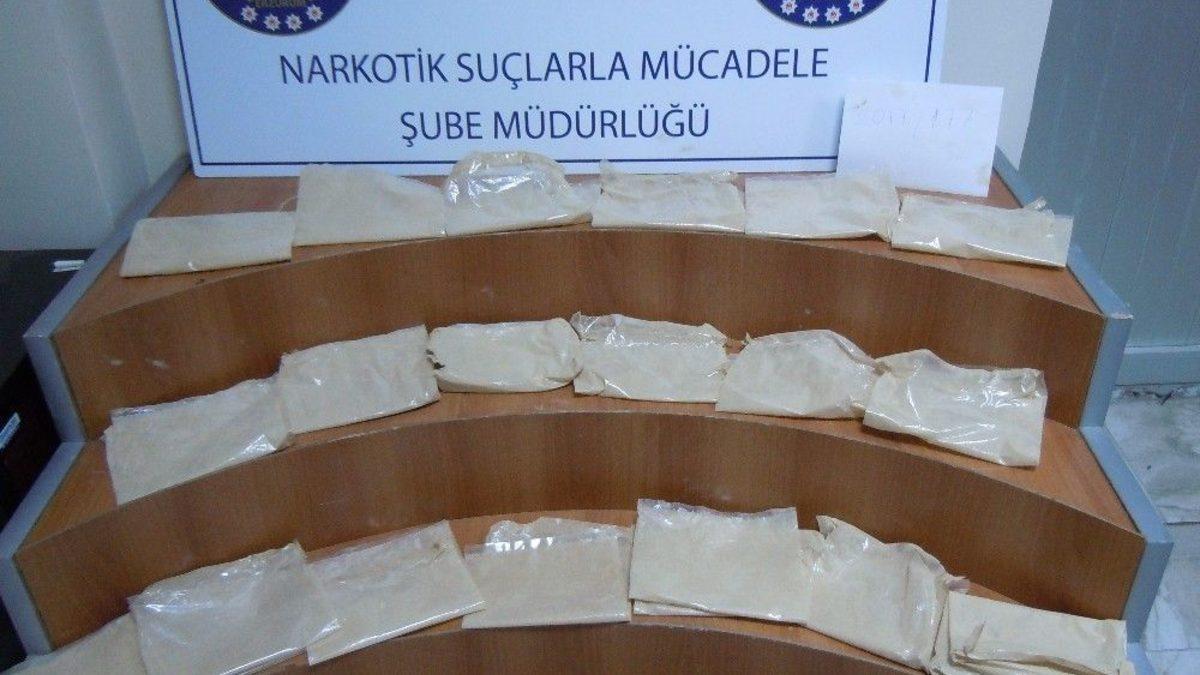 Erzurum Emniyet Müdürlüğü Narkotik Suçlarla Mücadele Şube Müdürlüğü ekiplerince gerçekleştirilen operasyonda def içerisine gizlenmiş 6 kilogram 510 gram eroin ele geçirildi.Edinilen bilgiye göre, kent merkezinde kargo bölge dağıtım merkezinde yapılan çalışmalarda Van’dan İstanbul’a gönderilen kargoya narkotik dedektör köpeği Dük’ün tepki vermesi üzerine arama yapıldı. Aramada, def olarak tabir edilen 10 adet müzik aleti içerisinde zulalanmış vaziyette toplam 21 paket içerisinde dara ağırlığı toplam 6 Kilo 510 gram eroin maddesi ele geçirildi.Ekiplerin ayrıca kargo dağıtım merkezindeki aramalarında 14 adet kargo gönderisi içerisinde toplamda 17 bin 140 adet bandrolsüz kaçak sigara ele geçirildiği açıklandı.