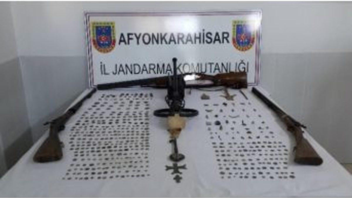 Afyonkarahisar’da jandarma ekipleri tarafından Hocalar ilçesi Çalca köyünde bulanan bir evde yapılan aramalarda 501 adet tarihi eser ele geçirildi.İl Jandarma Komutanlığı ekiplerince yapılan operasyonda 501 parça tarihi eser ele geçirildiği bildirildi. Konuya ilişkin yapılan açıklamada, “Afyonkarahisar İl Jandarma Komutanlığı ekipleri tarafından Hocalar İlçesi Çalca Köyünde N.T isimli şahsa ait evde, yapılan aramada; 501 adet tarihi eser, 1 adet detektör ve 3 adet ruhsatsız av tüfeği ele geçirilmiştir. Meydana gelen olayla ilgili olarak 1 şüpheli hakkında gerekli yasal işlemler yapılarak adli makamlara sevk edilmiştir. Afyonkarahisar İl Jandarma Komutanlığı suç ve suçlularla mücadelesine kararlılıkla devam etmektedir” denildi.