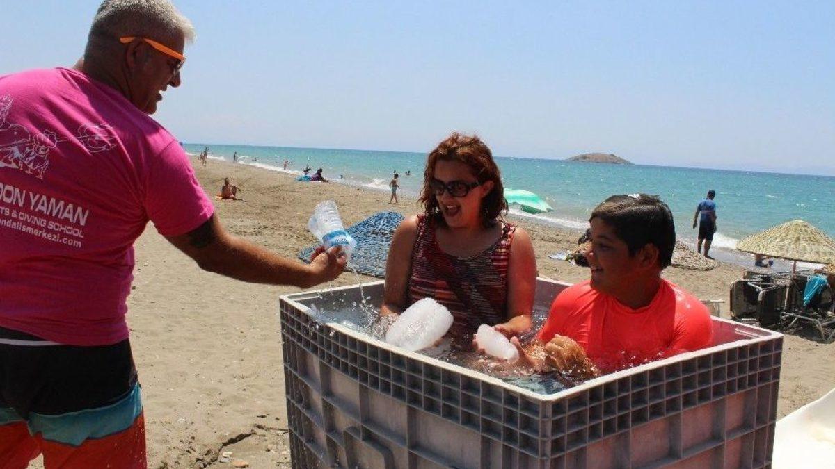 İzmir’de hava sıcaklıklarının günden güne artması, vatandaşları farklı serinleme yöntemlerine itiyor. Gümüldür’de denizde yüzmelerine rağmen serinleyemeyen bazı vatandaşlar, içi su dolu konteynere girerek buzlarla serinledi.Meteoroloji 2. Bölge Müdürlüğünden alınan bilgiye göre İzmir, Aydın ve Manisa’da hava sıcaklığı, önümüzdeki günlerde biraz daha artarak 2 ile 4 derece üzerine çıkacak. İzmir’de Cumartesi gününe kadar hava sıcaklığı 37 derece olacak. Durum böyle olunca vatandaşlar da denizin dibinde olmalarına rağmen serinleyemedikleri için kendilerine farklı serinleme yöntemleri buldu. Bazı vatandaşlar, Gümüldür’de denizden çıktıkları gibi kendilerini su dolu konteynerin içine atarak buzlarla serinlemeye çalıştı."Hava sıcak, deniz de sıcak”Tuğçe Koçaş, "Hava çok sıcak, deniz kar etmiyor. Rüzgar esse de hiçbir faydası yok. Denize rağmen serinleyemeyince buzlarla serinlemeye çalışıyoruz" diye konuşurken, Toprak Yaman ise "Denizden çıktım ama deniz de sıcak. Bu yüzden buz kalıplarıyla serinlemeye çalışıyoruz” dedi.Deniz dibinde buzla serinleme fikrini ortaya atan Murat Yaman, "Hava sıcak, deniz de sıcak. Biz de insanlar serinlesin diye su kovasına buz koyduk. Millet görüyor, atlıyor kovanın içinde. İsteyene buz partisi yapıyoruz" şeklinde konuştu.