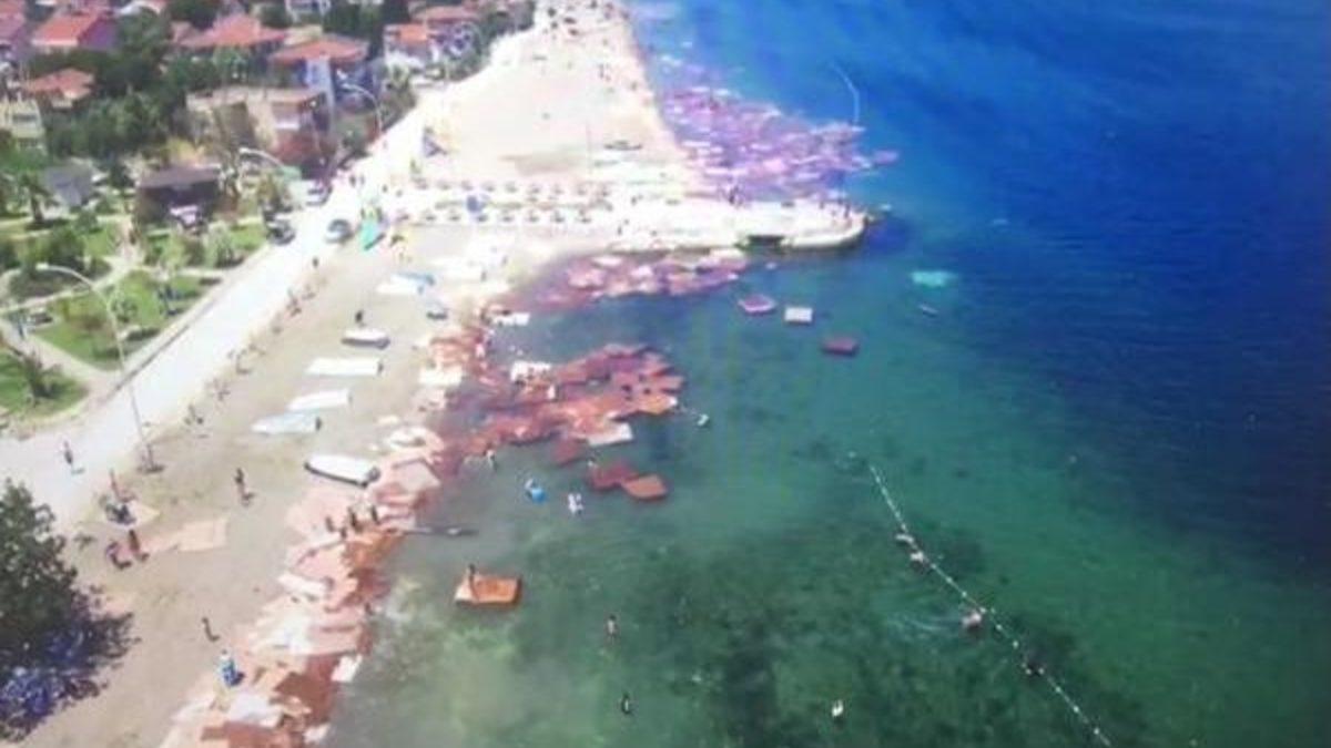 Denize girmek isteyen tatilcilerin, sahili kaplayan suntaları kıyıya çıkarmak için yoğun çaba göstermeleri bir vatandaş tarafından havadan 'Drone' ile görüntülendi. Görüntülerde 2 kilometrelik sahil şeridine sürüklenen suntalar ve vatandaşların bunları denizden çıkarması yer aldı.