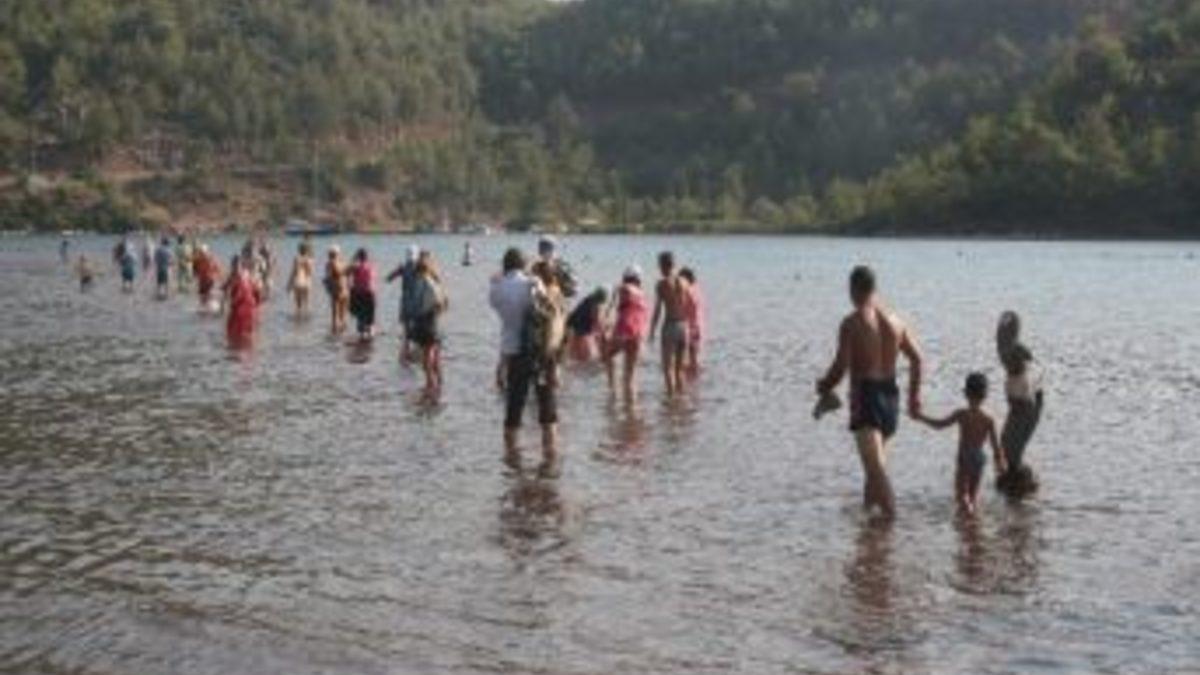 Muğla'nın Marmaris ilçesi Orhaniye Köyü’nde bulunan ve denizin içinde kumlardan oluşan yol nedeniyle insana su üstünde yürüyormuş hissi veren Kızkumu turistlerin akınına uğruyor.