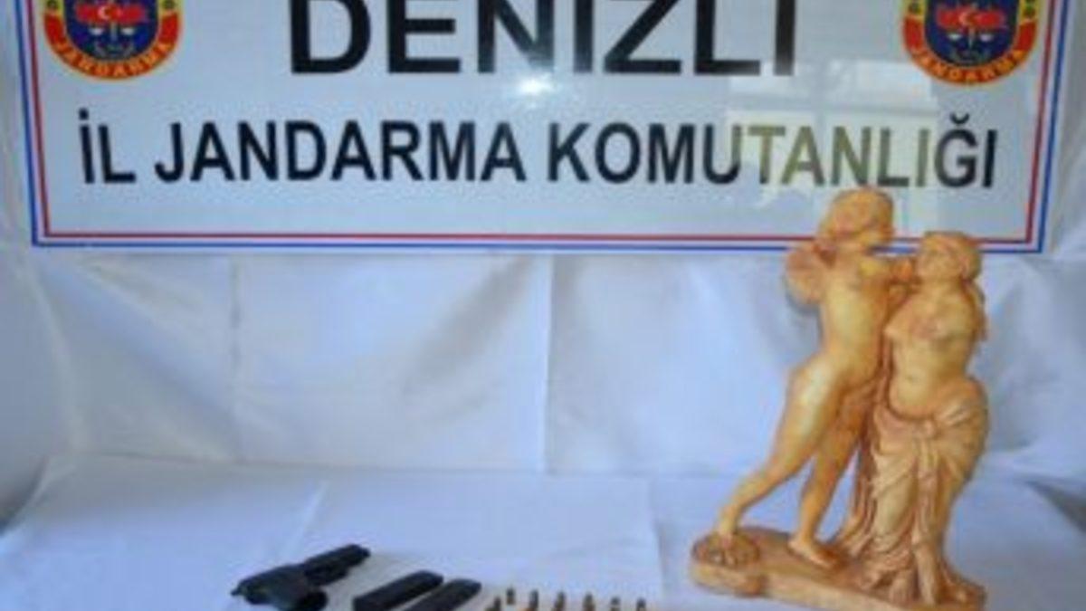 Denizli’nin Acıpayam ilçesine bağlı Kumafşarı beldesinde tarihi eser niteliğinde heykellerin satılacağı istihbaratını alan Denizli İl Jandarma Komutanlığı ekipleri, bu kapsamda çalışma başlattı. Acıpayam yolu üzerinde iki şüpheli aracı durduran jandarma ekipleri, araçlarda arama yaptı. Yapılan aramada 1 mermer heykel, 1 altın sikke, 1 tabanca, 2 şarjör, 27 tabanca fişeği ele geçirildi. Olayla ilgili 4 kişi adli makamlara sevk edildi.