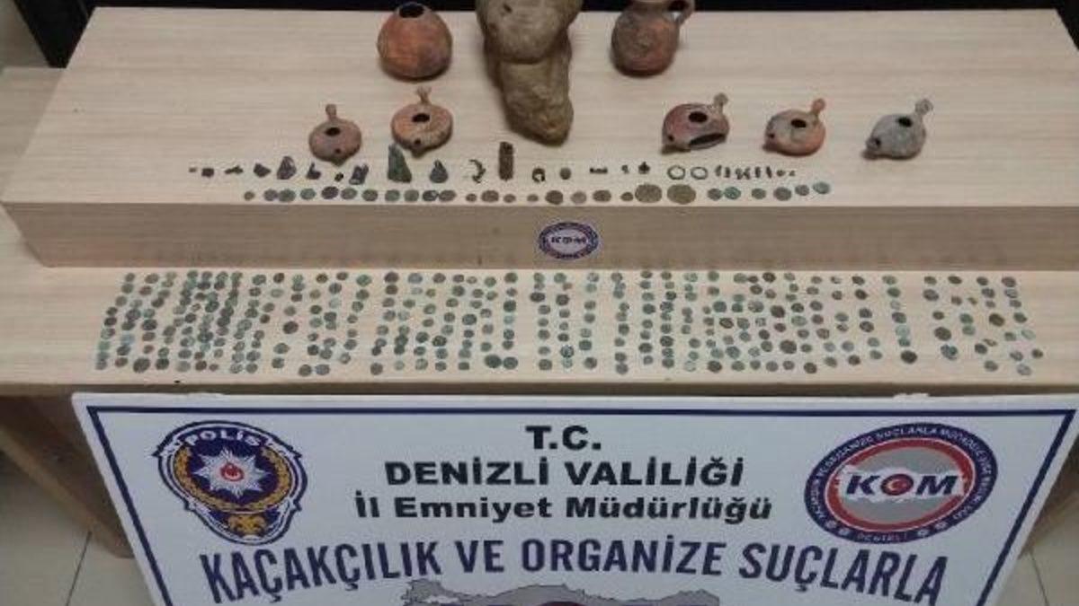 Ferah IŞIK/DENİZLİ, İl Emniyet Müdürlüğü Kaçakçılık ve Organize Suçlarla Mücadele Şube Müdürlüğü ekipleri, bir kişinin elindeki tarihi eserleri satacağı bilgisini edinince, harekete geçti. Saraylar mahallesindeki bir iş yerinde yapılan operasyonda,; Roma dönemine ait 341 sikke, 34 kadın başı, kabara başı, kandil, testi, halka ve çıngırak ele geçirildi. Gözaltına alınan ve adı açıklanmayan kişi hakkında, Kültür ve Tabiat Varlıkları Koruma Kanunu'na muhalefet suçundan işlem yapıldığını açıkladı. Ele geçirilen tarihi eserlerin Denizli Müze Müdürlüğü'ne teslim edildiğini belirtildi.