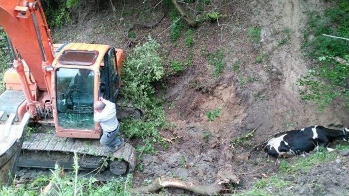 Tekirdağ’ın Malkara ilçesinde dere boyuna düşen inek 1 saatlik çalışma sonrası kepçe yardımıyla kurtarıldı.İlçeye bağlı Hacısungur Mahallesi’nde bir vatandaşa ait inek, engebeli araziden geçtiği sırada dengesini kaybederek dereye düştü. Haber verilmesi üzerine bölgeye giden Karaiğdemir Baraj Sahası Sulama Kooperatifi Operatörü Birol Özgen, kepçe yardımıyla ineği 1 saatlik uğraş sonrası sağ salim kurtardı.