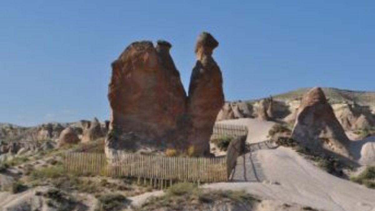 NEVŞEHİR, (DHA)- KAPADOKYA Bölgesi'nde binlerce peribacasının bir arada bulunduğu ve bu nedenle 'Perili Vadi' olarak da bilinen Devrent Vadisi'ndeki 'Deve' silüetli peribacasının çevresine koruyucu çit yerleştirildi