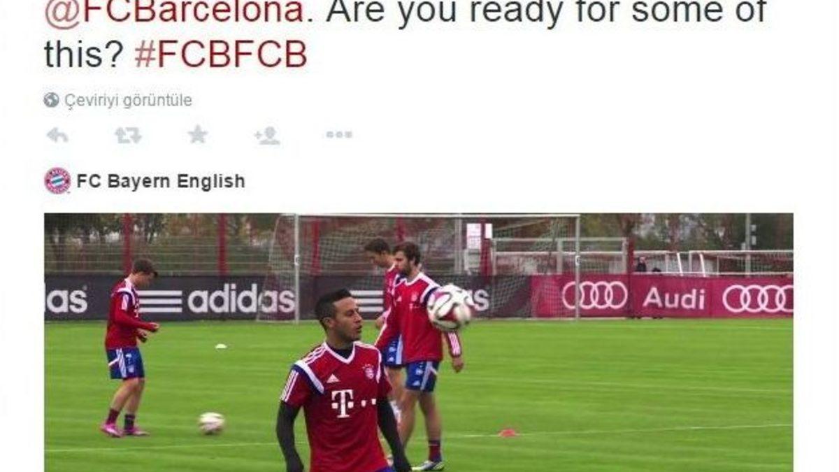 UEFA Şampiyonlar Ligi yarı final maçı öncesinde Barcelona ile Bayern Münih sosyal medya üzerinde kapıştılar.UEFA Şampiyonlar Ligi yarı final maçı öncesinde Katalan temsilcisi Barcelona, kendi evinde ağırlayacağı Almanya temsilcisi Bayern Münih ile Twitter üzerinden birbirlerine tatlı sataşmalarda bulundular. Münih, Barcelon’dan transfer ettiği Thiago Alcantara’nın görüntülerini koyarak bir video hazırladı. Hazırladığı videoya altına bir müzik koyan Alman temsilcisi, Barcelona’nın resmi hesabına bu video etiketleyerek, "Barcelona sizinle oynayacağız. Bunlardan bazılarına hazır mısınız?" yazdı.BARCELONA MESSI VE NEYMAR İLE CEVAP VERDİBarcelona ise Bayern Münih’in bu videosuna yıldız futbolcuları Neymar ve Messi ile cevap verdi. Barcelona videoyu paylaşarak, "Bunları getiriyoruz. Bu oyuncularımız da onların aynısını yapabilirler" yazdı.
