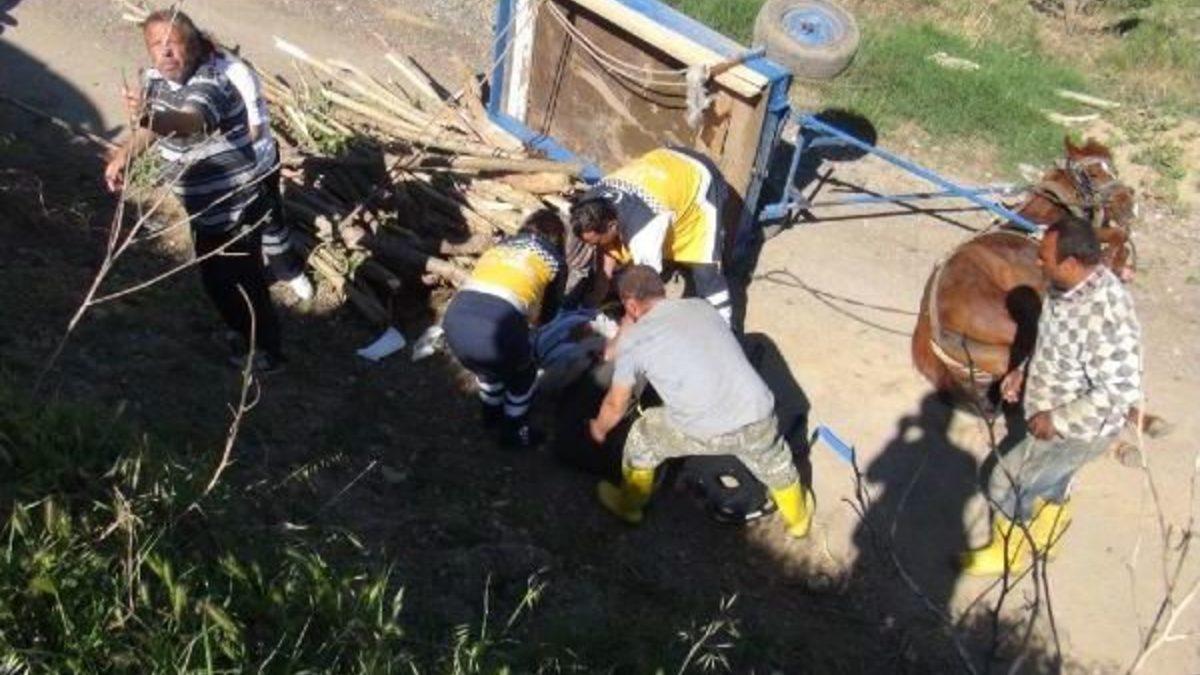 Ali Can ZERAY/EDİRNE, Yıldırım Mahallesi’nde oturan Mehmet Top, eşi Nurten ve torunu Şeyma Top ile birlikte önceki gün yaşanan fırtınada devrilen ağaçların dallarını toplamak için at arabasıyla Kazanova mevkiine gitti. Bir süre dalları topladıktan sonra dönüş yoluna geçen Mehmet Top idaresindeki at arabası Tunca Nehri kenarındaki sedde üzerinde ilerlediği sırada kum yüklü kamyonun sıkıştırması sonucu şarampole yuvarlandı.