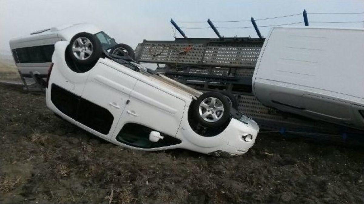 Tekirdağ’ın Malkara ilçesinde yoldan çıkan TIR şarampole devrildi. TIR’ın üzerinde yüklü 3 sıfır araç ise tarlaya yuvarlandı.Kaza, Malkara-Hayrabolu yolu Karacagür Mahallesi mevkiinde meydana geldi. Edinilen bilgiye göre, Arif K. (45) yönetimindeki fabrika çıkışlı yeni araçlarla yüklü 34 TN 8779 ön, 34 TN 8820 arka plakalı TIR, sisli havanında etkisiyle kaygan zeminde yoldan çıkarak şarampole devrildi.Kazada devrilen TIR’ın üzerinden düşen 3 otomobil, takla atarak tarlaya yuvarlandı. Sürücü kazayı yara almadan atlatırken, tarlaya yuvarlanan otomobil kurtarıcı vinç sayesinde tarladan çıkarıldı.Jandarma kaza ile ilgili soruşturma başlattı.