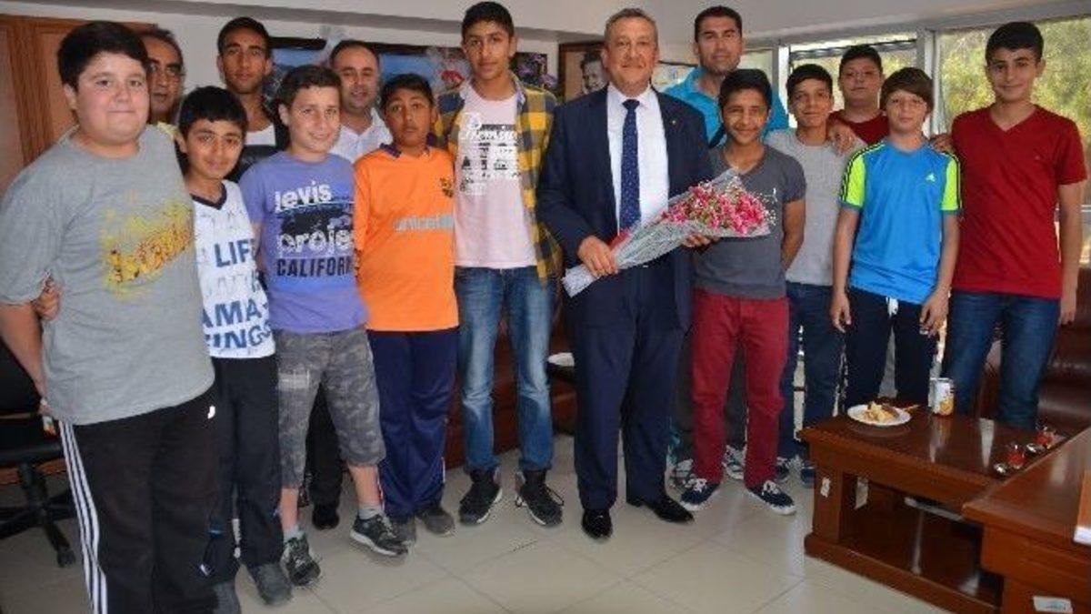 Başarılarıyla adından sık sık bahsettiren Dikili Güneş Spor Küçük Erkek Hentbol Takımı, Dikili Belediye Başkanı Mustafa Tosun’u makamında ziyaret etti.Hedeflerinin Türkiye Şampiyonası’na katılmaya hak kazanmak olduğunu belirten Dikili Güneş Spor Başkanı Bekir Argun ve takım antrenörü Muhlis İlter, Dikili Belediye Başkanı Mustafa Tosun’a takımlarına verdiği destekten dolayı teşekkür etti. Başkan Tosun, ziyarete katılan tüm sporcuları tebrik ederek başarılarının devamını diledi.Dikili Güneş Spor takım antrenörü Muhlis İlter, 2013 - 2014 hentbol sezonunda il birinciliği müsabakalarında Güneş Spor Küçük Erkek Hentbol Takımı olarak, 7 takım arasından 4'üncü olduklarını ve bu sonuçla Türkiye Şampiyonası eleme guruplarına katılmaya hak kazandıklarını belirterek,“9 - 13 Mayıs 2014 tarihleri arasında Balıkesir’in Erdek ilçesindeki turnuvada Türkiye Şampiyonası yarı finallerine gitme hakkı kazandık. İzmir Büyük Şehir Belediyesi Hentbol takımının elenmesi sonucunda, Güneş Spor Küçük Erkek Hentbol Takımı yarı finallerinde İzmir'i temsil edecek iki takımdan biri oldu. Bu başarıya giden yolda başkanımız Mustafa Tosun’un bizlere verdiği desteğin önemli yeri vardır” dedi.Aydın Didim’de 30 Mayıs-1 Haziran tarihinde gerçekleştirilecek Küçük Erkekler Türkiye Şampiyonası yarı finallerinde Ankara TED Koleji Spor Kulübü, Denizli Büyükşehir Belediye Spor Kulübü ve Alanya Belediyesi Spor Kulübü’yle karşılaşacak takıma başarılar dileyen Başkan Tosun, “Belediye olarak ilçemizde yer alan tüm takımlara olduğu gibi imkânlarımız dâhilinde bu genç ve başarılı arkadaşlarımıza da desteğimizi yine sağlayacağız. Gerek hentbol gerekse diğer spor branşlarının organizasyonlarının ve altyapısının daha güçlü hale getirilmesi için ne gerekiyorsa onu yapıyoruz ve yapmaya devam edeceğiz” dedi.Dikili Güneş Spor’da forma giyen üç öğrencinin Manisa Güzel Sanatlar ve Spor Lisesi’ni kazandıklarını belirten takım antrenörü İlter, “Sporcularımızdan Emre Güner 6’ncı, Hüseyin Dinç 8’inci ve Emre Taşır 23’üncü olarak güzel sanatlar ve spor lisesine girmeye hak kazandı” dedi.Kulüp Başkanı Bekir Argun ise, Dikili Güneş Spor’un hentbol takımında forma giyen sporculardan “Anadolu Yıldızları” Küçük Erkekler Turnuvası İzmir il karmasında Rasim Şekerci, Şevket Yağmuroğlu ve Eren Er’in gösterdiği başarılar sonucu yer aldığını ifade etti. Argun, Dikili Güneş Spor Hentbol Takımı’nın kazandığı başarılarla Dikili’yi en güzel şekilde tanıtmaya devam edeceğini sözlerine ekledi.Ziyaret sonunda spor branşlarından futbolun daha ön planda tutulmasına rağmen, hentbolu gençlere sevdirerek takımın güzel sonuçlar elde etmesine zemin hazırlayan kulüp Başkanı Bekir Argun ve takım antrenörü Muhlis İlter’i içtenlikle kutlayan Başkan Tosun şöyle konuştu: “Dikili’de özellikle gençlerimizin daha çok spora yönelmesi için çalışmalarımızı sürdürmeye devam ediyoruz. Genç sporcularımızın daha güzel koşullarda çalışabilmesi için spor kompleksi projemizi kısa zamanda hayata geçireceğiz. Bu pırıl pırıl gençlerimizin sosyal hayata girmelerine ve kötü alışkanlıklardan uzak durarak başarı elde etmelerinde sporun büyük bir yeri var. Gençleri bu konuda teşvik etmek için adım adım tüm aşamalar tamamlanacak ve Dikilimiz turizmde olduğu gibi sporda da ülkemizin gözbebeği ilçesi olacaktır”