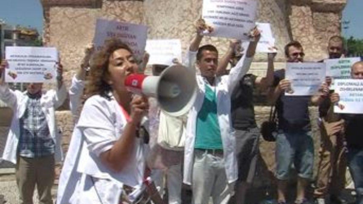 Diplomasızların iş yeri açmasına karşı çıkan bir grup diplomalı aktar Taksim Meydanı’nda eylem yaptı.
