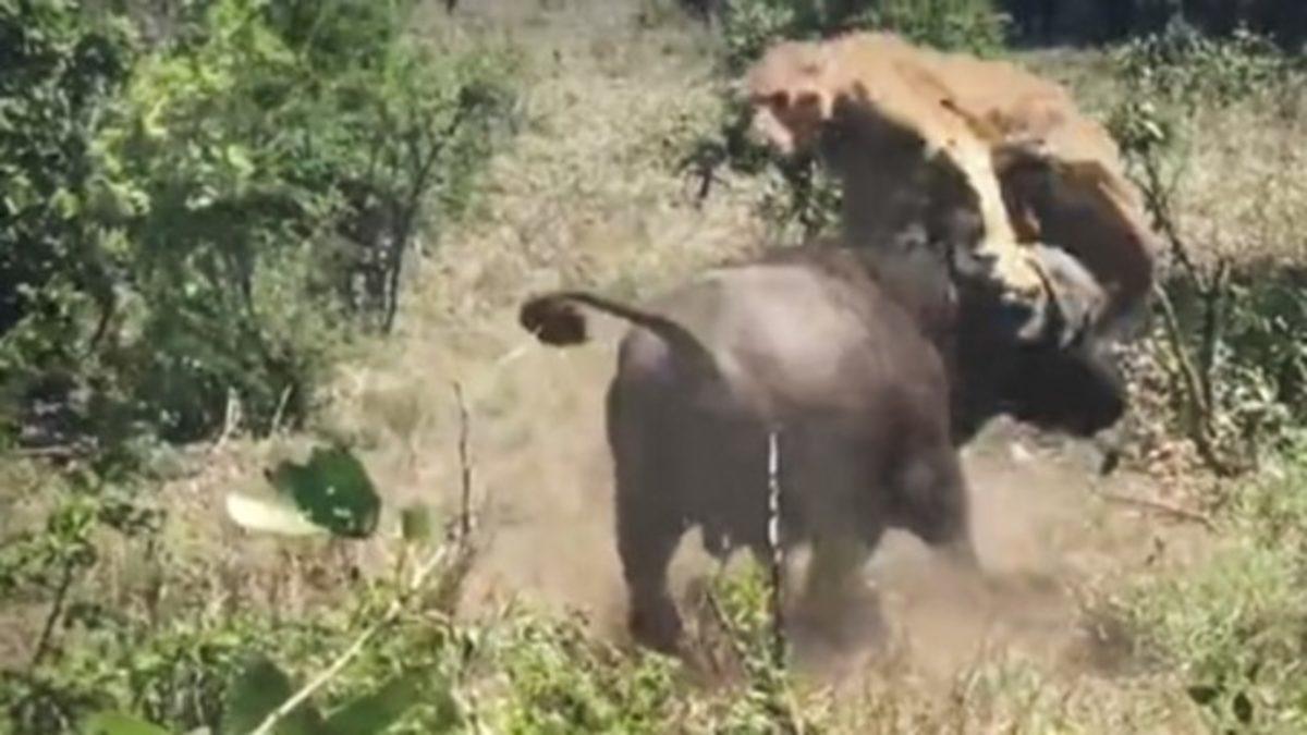 Güney Afrika'da bulunan Kruger Ulusal Parkında bufalonun açlıktan zayıf düşmüş dişi aslana saldırdığı anlar, safari yapan turistlerin kamerasına böyle yansıyor.