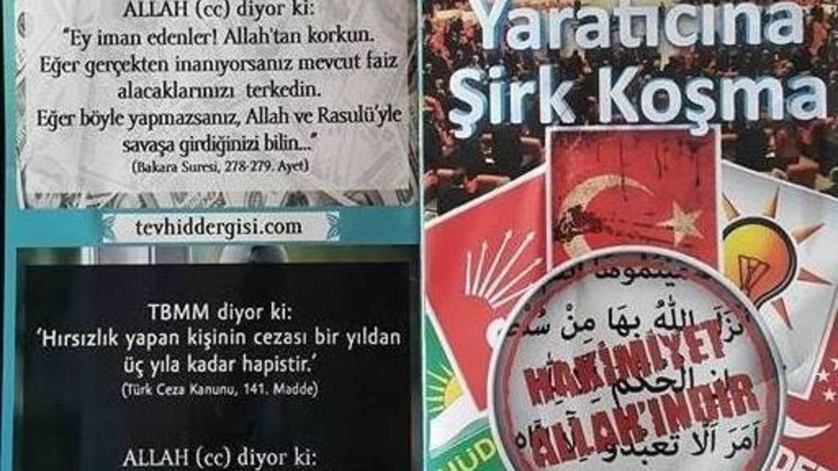 Tevhid Dergisi tarafından Diyarbakır’da üzerinde, “Oy kullanma, Yaratıcına şirk koşma” yazan broşürler dağıtıldı. Derginin internet sitesinden yapılan açıklamada ise, oy kullanmamaları için seçim gününe kadar 1 milyon kişiye kısa mesaj, 5 milyon kişiye de e-posta gönderileceği bildirildi.Tevhid Dergisi tarafından, Diyarbakır’da üzerinde “Oy kullanma, Yaratıcına şirk koşma” yazan ve içeriğinde ayet ve yasaların karşılaştırıldığı broşürler dağıtıldı. Özellikle merkez Bağlar ilçesinde yoğunlukla dağıtılan broşürlerde, vatandaşların seçimlerde hiçbir partiye oy vermemeleri istendi. Broşürlerde, “Büyük bir seçimle karşı karşıyayız. Ya Allah’ın hükmünü ve şeriatını ya da O’nun dışındaki küfür kanunlarının mimarlarını destekleyeceğiz. Mühür bizim elimizde. ‘Evet’ diyeceğimiz hiçbir parti bize, çocuklarımıza, ülkemize ve dünyaya barışı, huzuru getiremeyecek. Çünkü huzuru yalnızca ve yalnızca İslam şeriatı tesis edebilecek. Seni yaratan, yerden ve gökten çeşit çeşit nimetlerle rızıklandıran, yerde ne varsa senin emrine amade kılan Rabbine isyan etme. Hüküm koymak Allah’a ait iken, kendi partilerini hatta ailelerini dahi idare edemeyen sözde vekillere seni yönetme, hayatını düzenleyecek (!) kanunları yapma yetkisi verme" denildi. Broşürlerde, yasalar ve ayetler ise şu şekilde karşılaştırıldı:"TBMM diyor ki, ‘Egemenlik, kayıtsız şartsız milletindir. Yasama, yürütme ve yargı yetkileri de çeşitli devlet organlarına aittir.’ (Anayasa, 6-9 maddeler) Allah (cc) diyor ki, ‘Hüküm sadece Allah’a aittir. O size kendisinden başkasına ibadet etmemenizi emretmiştir. İşte dosdoğru din budur. Fakat insanların çoğu bilmezler.’ (Yusuf süresi 40’ıncı ayet) TBMM diyor ki, ‘Evli veya bekar tüm kadın ve erkekler, zina ettikleri taktirde herhangi bir suçla karşılaşmazlar.’ Allah (cc) diyor ki, ‘Zina eden kadın ve zina eden erkekten her birine yüz sopa vurun. Allah’a ve ahiret gününe inanıyorsanız, Allah’ın dininde (hükümlerini uygularken) onlara acıyacağınız tutmasın. Müminlerden bir grup da onlara uygulanan cezaya şahit olsun.’ (Nur suresi 2’nci ayet). TBMM diyor ki, ‘Hırsızlık yapan kişinin cezası bir yıldan üç yıla kadar hapistir.’ Allah (cc) diyor ki, ‘Hırsızlık eden erkek ve kadının, yaptıklarına karşılık bir ceza ve Allah’tan bir ibret olmak üzere ellerini kesin. Allah izzet ve hikmet sahibidir. (Maide süresi 38’inci ayet)”1 MİLYON İNSANA MESAJ GÖNDERİLECEKÖte yandan, derginin internet sitesinden yapılan açıklamada, “Haziran seçimlerinin, bu seçimlere katılan partileri ve oy kullanacak seçmeni ilgilendirdiği kadar Müslümanları da ilgilendirdiği” belirtilerek, şunlar kaydedildi:"Seçimler özellikle ’Oy kullanmanın hükmü’ üzerinden tevhidi insanların gündemine sokmak için önemli bir fırsat. Bu fırsatı değerlendirmek için bizler de Allah Azze ve Celle izin verirse bazı faaliyetlerde bulunacağız. 1-7 Haziran arasında yapacağımız bu çalışmalardan haberdar olabilmeniz için size kısa kısa bilgiler vermek istiyoruz. Adana, Ankara, Bursa, Diyarbakır, Erzurum, Gaziantep, İstanbul, İzmir, Kayseri, Kocaeli, Konya, Sakarya, Şanlıurfa, Manisa, Kahramanmaraş, Van, Denizli, Mardin, Malatya, Trabzon illerinde yaşayan 1 milyon kişiye oy kullanmaktan sakındıran içerikte kısa mesaj gönderilecek. 30’a yakın ilde insanların yoğun bir şekilde bulundukları mekanlara Allah Azze ve Celle’nin ayetleri ile TBMM kanunlarının karşılaştırıldığı afişlerden 30 bin adet yapıştırılacak. Yine 30’a yakın ilde 950bin adet broşür dağıtılacak. 5 milyon kişiye e-mail gönderilecek. 300 bin adet küçük boyutlu stickerlar meskenlerin girişlerine yapıştırılacak."