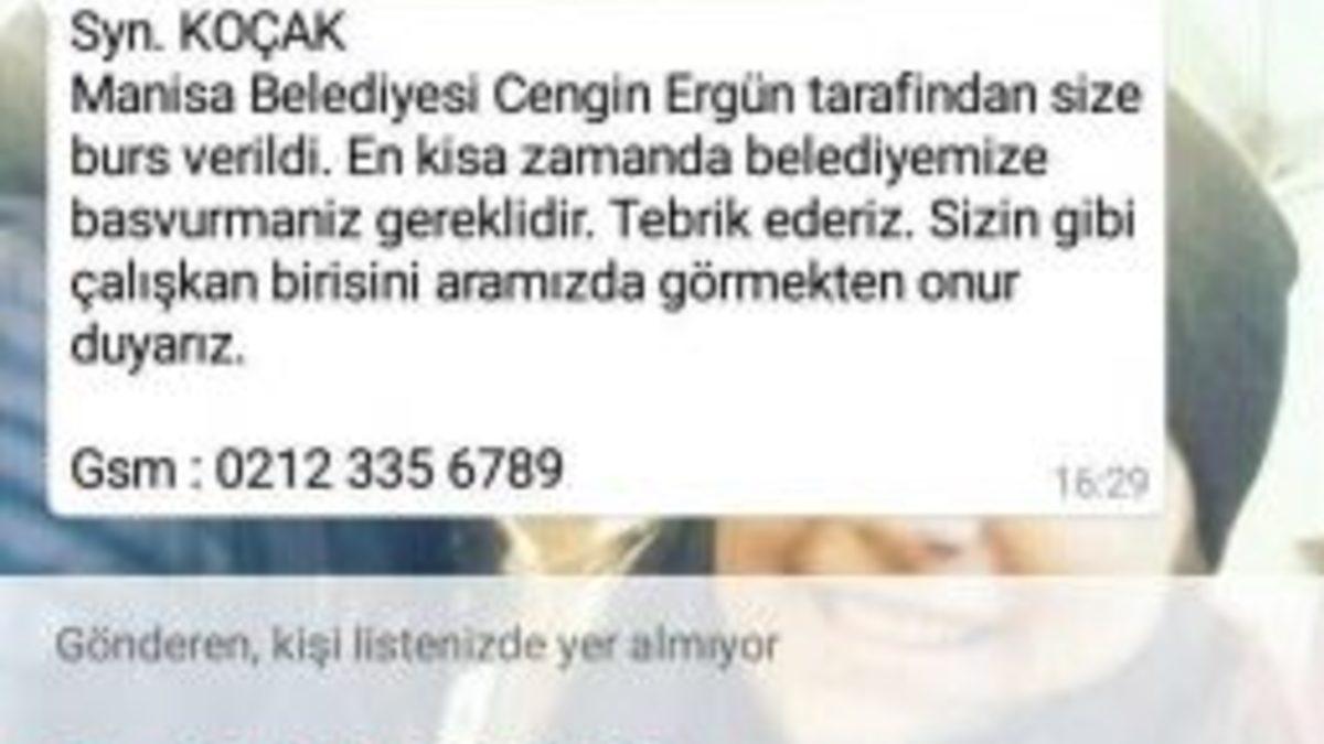 Manisa Büyükşehir Belediyesi üst düzey bürokratlarının isimlerini kullanarak vatandaşlardan para talebinde bulunan dolandırıcılar, bu kez de Büyükşehir Belediye Başkanı Cengiz Ergün’ün adını kullanmaya başladı.Çeşitli yöntemler kullanarak vatandaşları mağdur etmek isteyen bazı art niyetli kişi ya da kişiler, bu kez de akıl almaz bir yola başvurdu. Konuyla ilgili Manisa Büyükşehir Belediyesinden yapılan açıklamada, vatandaşlara SMS yoluyla ulaşarak “Manisa Belediyesi Cengiz Ergün tarafından size burs verildi. En kısa zamanda belediyemize başvurmanız gereklidir. Tebrik ederiz. Sizin gibi çalışkan birisini aramızda görmekten onur duyarız. GSM: 0212 3356789” şeklinde bir yöntemle vatandaşları dolandırmaya çalışan kişilere kesinlikle itibar edilmemesi gerektiği vurgulandı. Açıklamada bu tür SMS, mesaj, e-posta ya da telefonla ulaşanların hemen kolluk kuvvetlerine bildirilmesi gerektiği belirtilirken, “Belediyelerin burs veremeyeceği yasal düzenlemeyle belirtilmiştir. Büyükşehir Belediye Başkanımız Sayın Cengiz Ergün’ün adını kullanarak sizlerden arama bekleyen bu art niyetli kişi ya da kişilere itimat etmemeniz, mağdur olmamanız açısından önemle duyurulur” ifadelerine yer verildi.