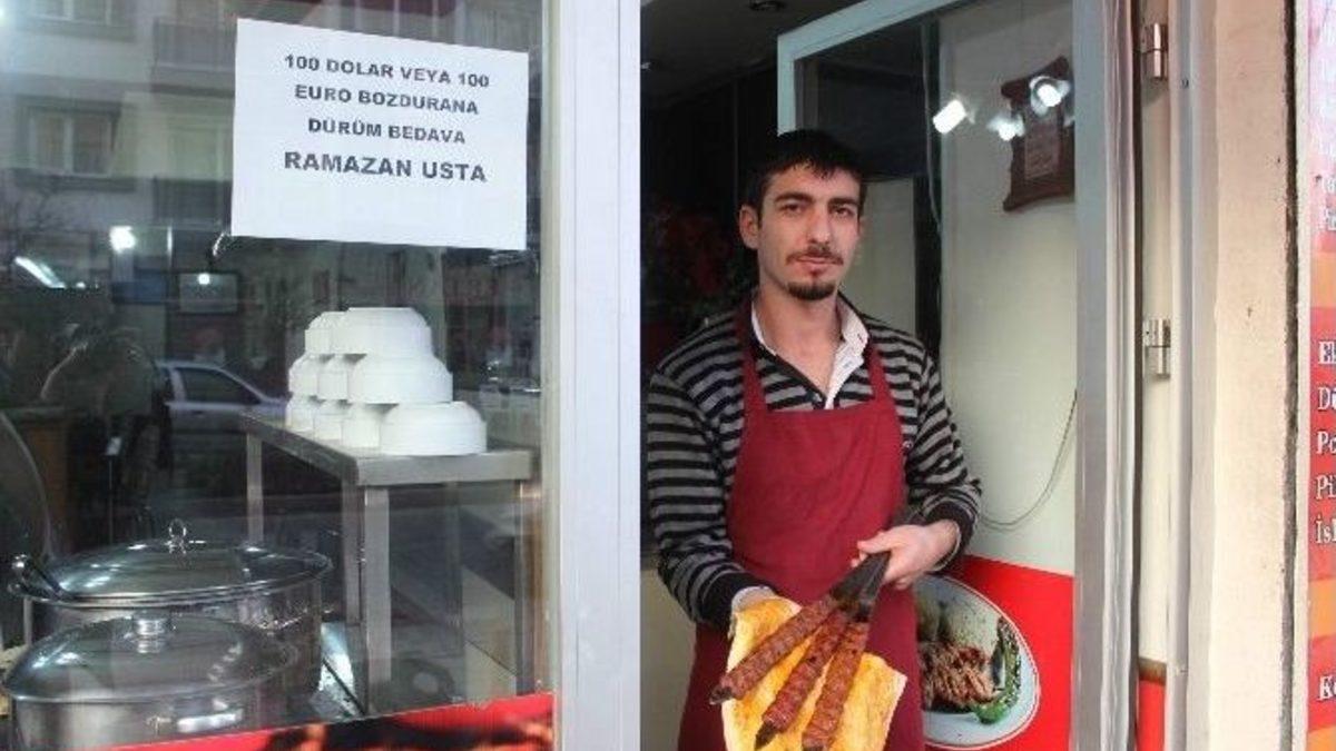 Cumhurbaşkanı Recep Tayyip Erdoğan’ın ‘Dolar ve Euro’larınızı bozdurun’ çağrısı üzerine Aydın’da bir kebapçı kampanya başlattı. Aydın Doğu Gazi Bulvarı üzerinde faaliyet gösteren Ramazan Usta adlı Kebap Salonu, 100 dolar bozdurup dekontunu getiren herkese kebap ısmarlıyor. Kendisinin doları olmadığı için böyle bir kampanya ile Cumhurbaşkanı Erdoğan’a destek vermek istediğini belirten Ramazan Barutçu, “Artık Amerika’nın bizi sömürmesini istemediğimiz için bu kampanyaya destek veriyoruz” dedi.Cumhurbaşkanı Recep Tayyip Erdoğan’ın çağrısı üzerine kampanya başlattığını belirten Ramazan Barutçu, camına yazı asarak herkesin Dolar ve Eurosu’nu bozdurup TL’ye geçmesini istedi. Dolar bozdurma çağrısına herkesin cevap vermesini beklediğini ifade eden Kebapçı Ramazan Usta, “Ülkemizin birilerine peşkeş çekilmesini istemiyoruz. Doları da istemiyoruz. Amerika bizi Dolar üzerinden sömürmeye başladı. Fetullah Gülen’i de aldılar. Bir türü teslim etmiyorlar. Bunların yanına kar kalmasını istemiyoruz. Biz artık ülkemizde Euro, Dolar istemiyoruz. Kim 100 Euro ve Dolar bozdurup faturasını bize getirirse biz ona bir Adana dürüm tavuk, ciğer ne isterse onu hediye ediyoruz. Vatandaşımızın hem karnı doysun hem de Doları elinden çıkarsın. Herkes TL ile çalışsın” diye konuştu.Cumhurbaşkanı Erdoğan’ın çağrısı üzerine kendi elinde Dolar ve Euro olmadığı için kampanyaya bu şekilde destek vermek istediğini belirten Ramazan Barutçu, kampanyayı duyanların kendisine destek verdiğini söyledi. Herkesin elini taşın altına koyup memleket için milli paramız TL’yi kullanması gerektiğini belirten Kebapçı Ramazan, “Kimse ‘Ben esnafım büyük iş adamları yapsın’ demesin. Elinde Dolar, Euro olanlar küçük büyük demeden bozdursun. Önemli olan memleket meselesi” diyerek bu kampanyanın ülkemiz için desteklenmesi gerektiğini söyledi.