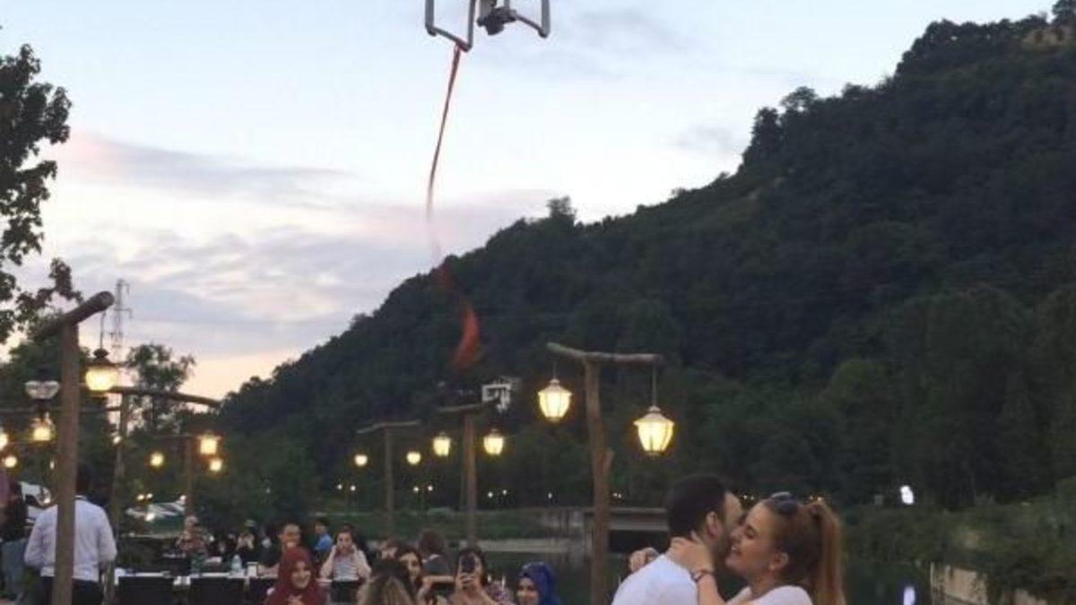 Trabzon'da bir yerel gazetede Haber Müdürlüğü görevi yürüten gazeteci Hakan Şener, 3 yıl önce tanıştığı özel bir sağlık kuruluşunda ebe olarak görev yapan Ülkü Aktürk'e ilginç bir yönetmle evlenme teklifinde bulunmaya karar verdi. Şener, Aktürk'ü gezme bahanesiyle Akçaabat ilçesindeki turizm merkezi Sera Gölü'ne götürdü. Buradaki bir restorantta oturan genç çiftin sohbeti sırasında Şener, bir arkadaşının yönlendirmesiyle yüksekten kendilerine yaklaşan Drone'a kırmızı iple bağlı olan yüzüğü alıp sevgilisi Aktürk'e evlenme teklif etti. Tek taş yüzüğü parmağına takan ve evlilik teklifini kabul eden Aktürk'ün yaşadığı mutluluk da görüntülere yansıdı. Birbirlerine sarılan çifti çevredeki vatandaşlar da alkışlayarak kutladı.