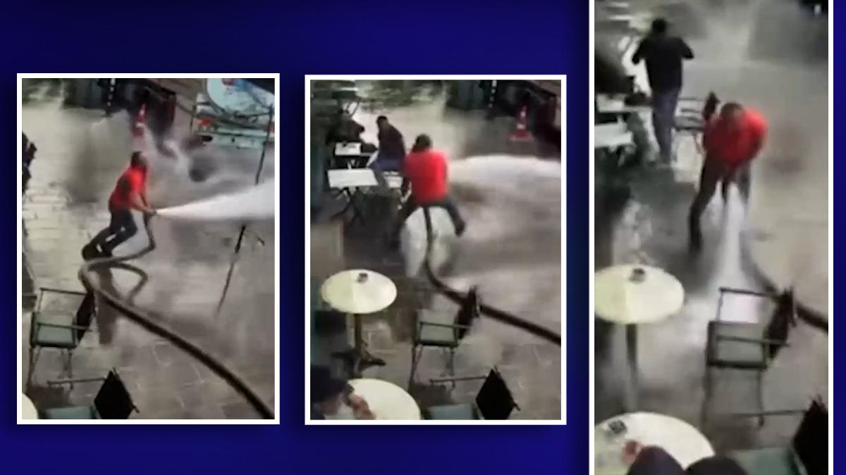 Tazyikli suyla ıslanınca ne yapacağını şaşıran müşterilerden biri dükkanın içine kaçarken diğerleri donakaldı. Ortaya çıkan komik anlar bir güvenlik kamerası tarafından kaydedildi.