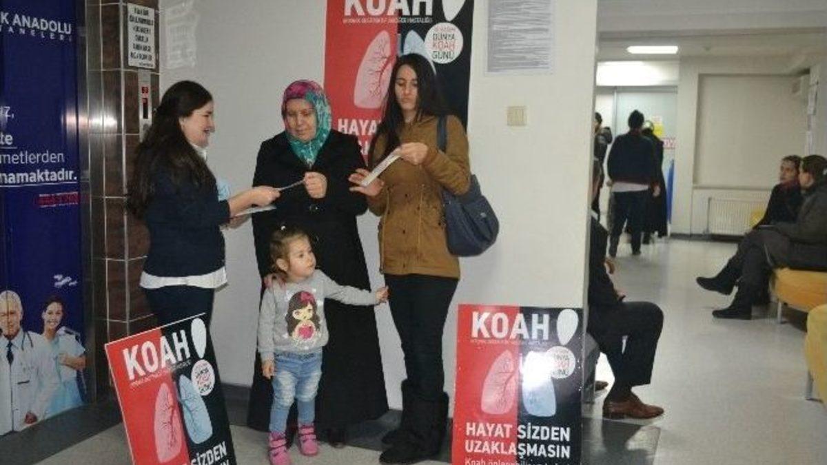 Samsun’da, Dünya KOAH Günü dolayısıyla bir hastanede vatandaşlara bilgilendirici broşürler dağıtıldı.Kronik Obstrüktif Akciğer Hastalığı (KOAH) ile ilgili farkındalık oluşturmak, vatandaşları bilgilendirmek amacıyla Samsun Büyük Anadolu Hastaneleri Meydan ve Çiftlik Şubelerinde kurulan stantlarda görevliler tarafından vatandaşlara broşürler verildi.Bilgilendirici afişlerin de asıldığı Meydan ve Çiftlik Şubelerinde "Hayat sizden uzaklaşmasın" sloganı ile Kronik Obstrüktif Akciğer Hastalığı’nın önlenebilir ve tedavi edilebilir bir hastalık olduğuna vurgu yapıldı. Hastalıkla ilgili olarak daha detaylı bilgi almak isteyenler ise ilgili uzman doktorlara yönlendirildi.KOAH’ın başlıca belirtilerinin, öksürük, hırıltılı solunum, balgam, nefes darlığı ve yorgunluğu olduğunu belirten Samsun Büyük Anadolu Hastaneleri’nden bölümün uzman doktorları şu bilgileri verdiler: "Akciğer solunumu gerçekleştirmemize yarayan organlarımızdır. KOAH, bir akciğer hastalığıdır. Bronşit ve akciğerdeki hava keseciklerinin zarar görmesi sonucu hava akımında kısıtlanma ile seyreden bir hastalıktır. KOAH hastalığının başlıca belirtileri; öksürük, hırıltılı solunum, balgam, nefes darlığı ve yorgunluktur. Öksürük ve balgam çıkarma önceleri sadece sabah görülür. Hastalar genellikle bu şikâyetleri önemsemezler ve sigara içmenin doğal bir sonucu olarak kabul ederler. Gerçekte, şiddetli olmayan öksürük ile birlikte az miktarda balgam çıkarmak çok önemli bir hastalığın yani KOAH’ın erken habercisi olabilir. KOAH hastalığının ana nedeni sigara kullanımıdır. Katı yakıtlar ile ısınma ve pişirme sonucu açığa çıkan zararlı gazlarda ana nedenlerden sayılabilir. Bu nedenle, hastalığın en önemli tedavisi sigaraya hiç başlanmamak veya başlanmışsa bırakılmak, tozlu ve dumanlı ortamlarda çalışmamak, bulunmamak ve en önemlisi de mutlaka bir uzman doktor tarafından tedavi edilmesi gerekmektedir.”