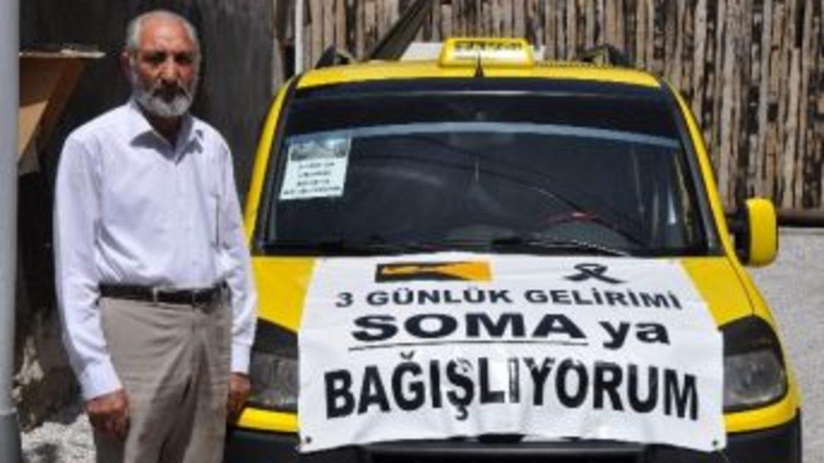 Malatya'da taksicilik yapan Hacı Sağlam, 3 günlük gelirini Soma'ya bağışladı.Manisa Soma'da meydana gelen maden faciasında hayatını kaybeden işçiler için yardım kampanyaları sürüyor. Malatya'da taksicilik yapan Hacı Sağlam, 3 günlük gelirini Soma'ya bağışladığını açıkladı.Taksisinin üzerine '3 günlük gelirimi Soma'ya bağışlıyorum' pankartını asan Sağlam, "Soma'da yaşanan maden faciasında hayatını kaybeden şehit kardeşlerimize Allah'tan rahmet, yakınlarına başsağlığı diliyorum" dedi.Sağlam, Soma'da yaşanan facianın kendisini ve ailesini derinden üzdüğünü ifade ederek, "Eşim ve çocuklarımla birlikte Soma'da hayatını kaybedenlerin yakınlarının acılarını paylaşmak adına 3 günlük gelirimizi Soma'ya bağışlamaya karar verdik. 3 günlük gelirimi, Soma'daki yetim yavrularımıza bağışlayacağım" ifadelerini kullandı.
