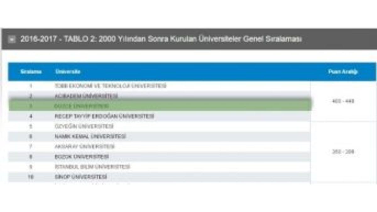 Düzce Üniversitesi 2000’den sonra kurulan üniversiteler içinde yine birinci oldu.Düzce Üniversitesi birinciliği elden bırakmıyor. Ortadoğu Teknik Üniversitesi Enformatik Enstitüsü bünyesinde faaliyetlerini yürüten URAP Araştırma Laboratuvarı, Ülkemizdeki üniversitelerin başarı sıralamalarını kamuoyuyla paylaşıyor. 2000 Yılından Sonra Kurulan Üniversiteler Genel Sıralamasında devlet üniversiteleri arasındaki birinciliğini koruyan Düzce Üniversitesi, akademik başarılarını istikrarlı bir şekilde sürdürmenin gururunu yaşıyor.Kurulduğu 2006 yılından günümüze birçok başarılı akademik çalışmalara imza atan ve bunun meyvelerini en iyi şekilde toplayan Düzce Üniversitesi, 2000 Yılından Sonra Kurulan Üniversiteler Genel Sıralamasında, 400-449 puan olarak belirlenen en üst puan diliminde, vakıf üniversiteleri olan TOBB Ekonomi ve Teknoloji Üniversitesi ile Acıbadem Üniversitesinin ardından üçüncü sırada yer aldı ve devlet üniversiteleri arasında ilk sırada yer alma başarısını yineledi.Ulusal başarısının yanında uluslararası alanda da eğitim kalitesini sürdüren ve her geçen gün dünya üniversitesi olma yolunda hızla ilerleyen Düzce Üniversitesi, 2016-2017 Dünya Üniversiteleri Sıralamasında ilk 2000 üniversite arasında yer almaya devam ediyor.Öğrenci odaklı eğitimi, donanımlı akademik kadrosu, modern derslikleriyle eğitimde zirveyi hedefleyen Düzce Üniversitesi yeni akademik başarılar kazanma heyecanıyla çalışmalarını azimle sürdürüyor.